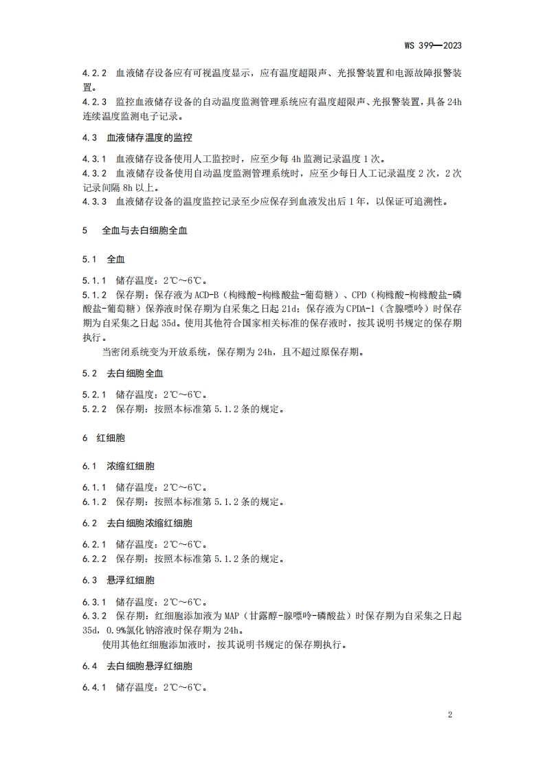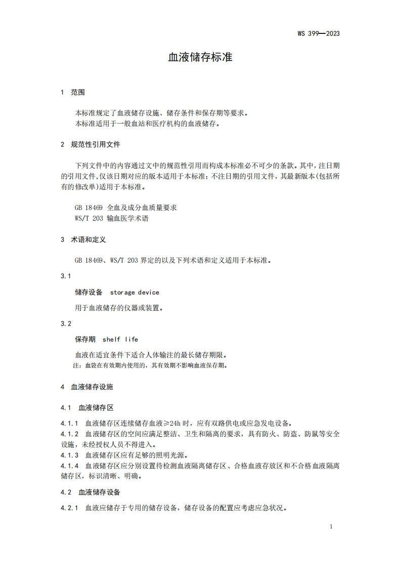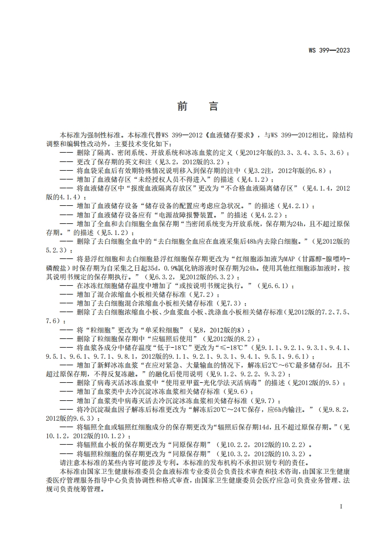 血液储存标准Standardforbloodstorage348072@abc7天前发布关注私信0.22MB8页050血液储存标准Standardforbloodstorage此内容为付费资源,请付费后查看¥13¥19黄金会员免费钻石会员免费立即购买您当前未登录!建议登陆后购买,可保存购买订单付费资源 第1页 / 共8页 第2页 / 共8页 第3页 / 共8页 第4页 / 共8页 第5页 / 共8页 试读已结束,还剩3页,您可下载完整版后进行离线阅读 THE END标准规范 文本预览 ICS11.020CCS C 05WS中华人民共和国卫生行业标准WS399-2023代替WS399-2012血液储存标准Standard for blood storage2023-09-05发布2024-09-01实施中华人民共和国国家卫生健康委员会发布 查看更多 收起部分 喜欢就支持一下吧收藏