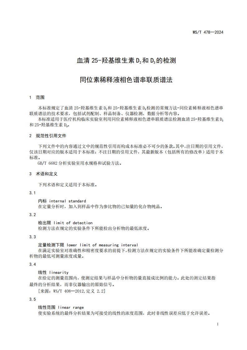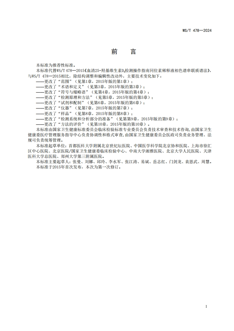 ICS11.020CCS C 50WS中华人民共和国卫生行业标准WS/T478-2024代替WS/T478一2015血清25-羟基维生素D,和D,的检测同位稀释液相色谱串联质谱法Measurement of serum 25-hydroxyvitamin D2 and D3-Isotope dilutionliquid chromatography tandem mass spectrometry2024-05-09发布2024-11-01实施中华人民共和国国家卫生健康委员会发布