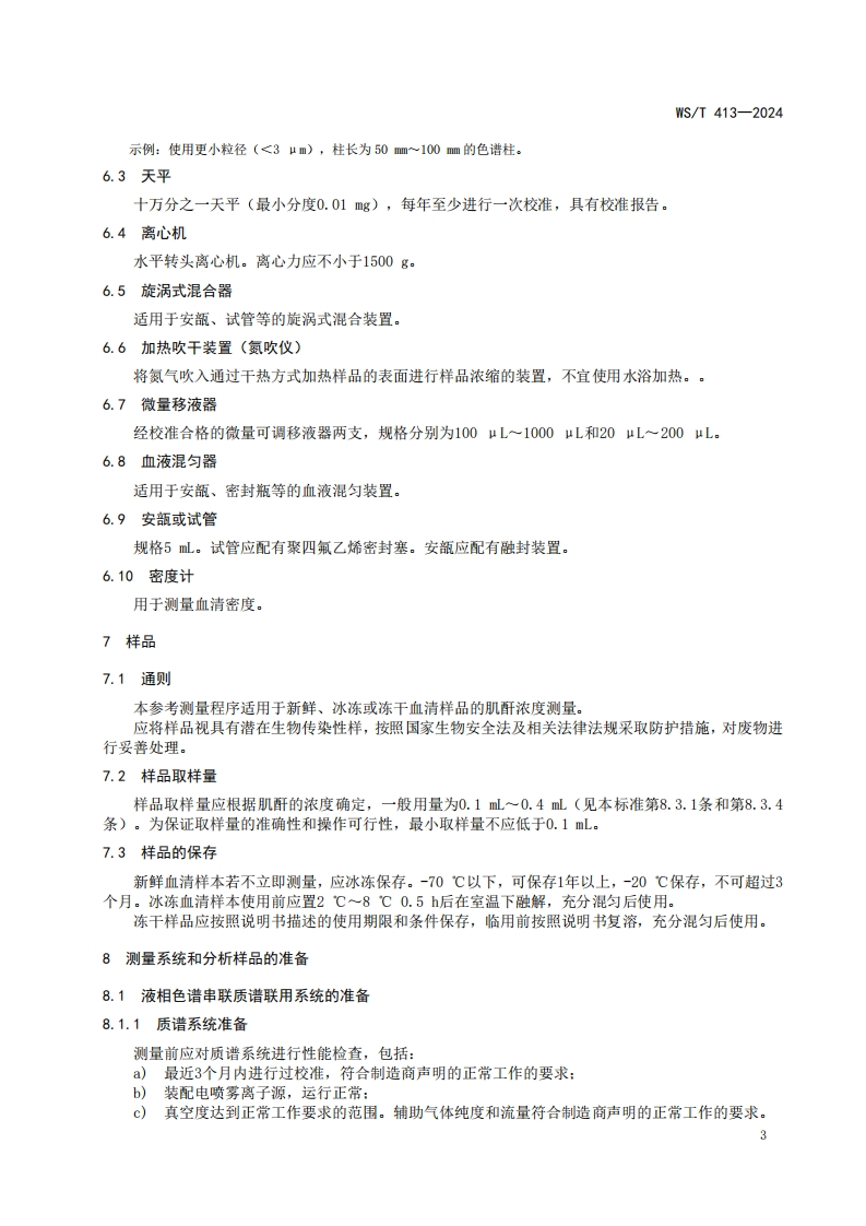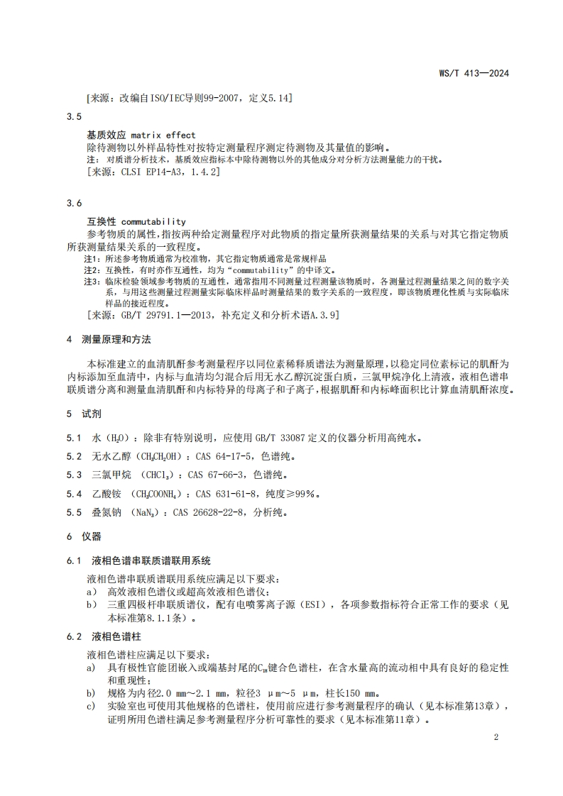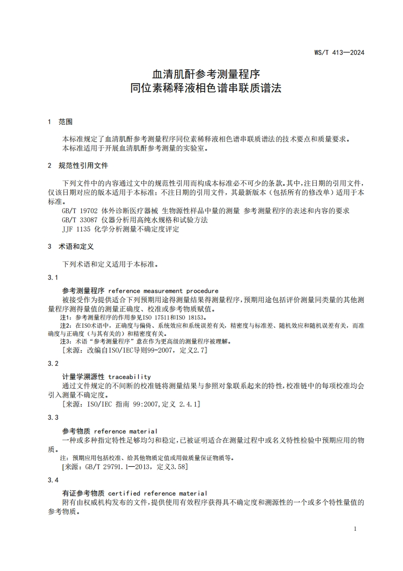 ICS11.020CCS C 50WS中华人民共和国卫生行业标准WS/T413-2024代替WS/T413-2013血清肌酐参考测量程序同位素稀释液相色谱串联质谱法Reference measurement procedure for serum creatinine-Isotope dilution liquid chromatography tandem mass spectrometry2024-05-09发布2024-11-01实施中华人民共和国国家卫生健康委员会发布