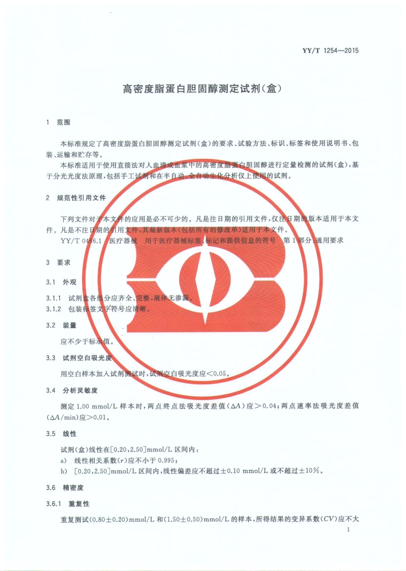 高密度脂蛋白胆固醇测定试剂(盒)Highdensitylipoprotein(HDL)cholesterolassaykit348072@abc6天前发布关注私信1.37MB9页021高密度脂蛋白胆固醇测定试剂(盒)Highdensitylipoprotein(HDL)cholesterolassaykit此内容为付费资源,请付费后查看¥13¥19黄金会员免费钻石会员免费立即购买您当前未登录!建议登陆后购买,可保存购买订单付费资源 第1页 / 共9页 第2页 / 共9页 第3页 / 共9页 第4页 / 共9页 第5页 / 共9页 试读已结束,还剩4页,您可下载完整版后进行离线阅读 THE END标准规范 文本预览 ICS11.100C44YY中华人民共和国医药行业标准YY/T1254-2015高密度脂蛋白胆固醇测定试剂(盒)High density lipoprotein(HDL)cholesterol assay kit2015-03-02发布2016-01-01实施国家食品药品监督管理总局发布 查看更多 收起部分 喜欢就支持一下吧收藏