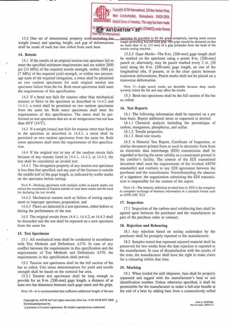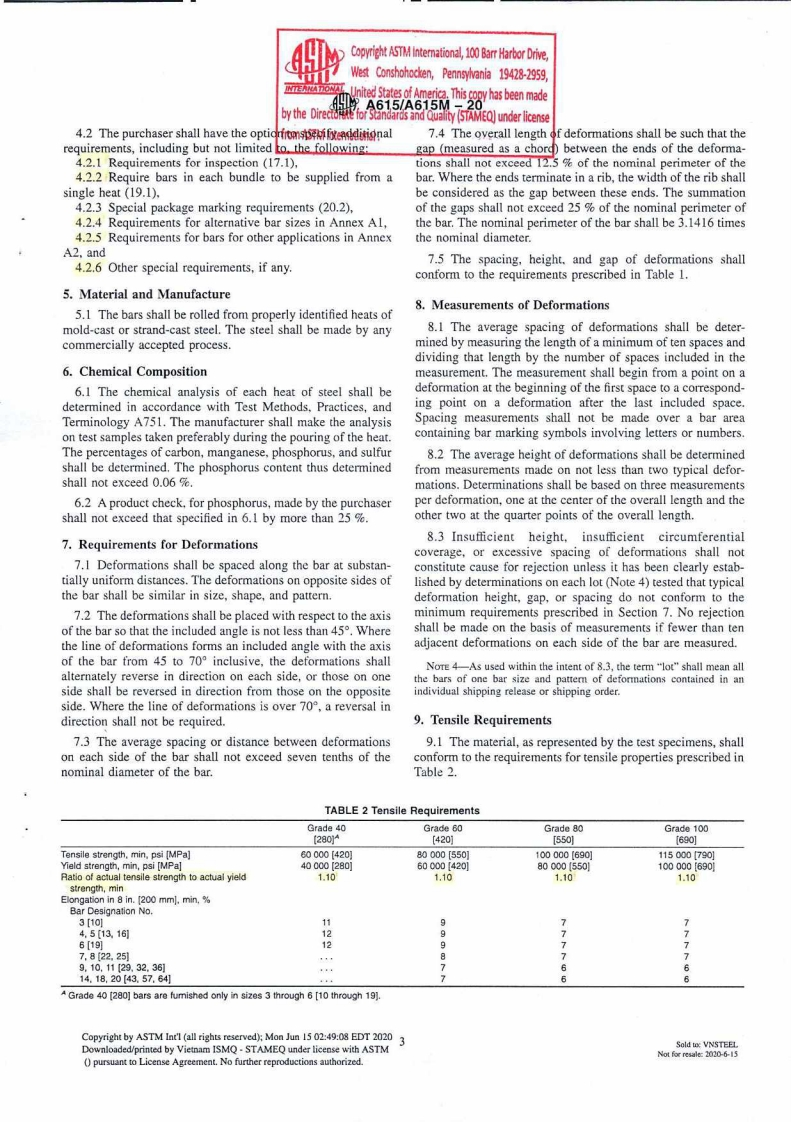 Thisoed in accordance with internationally recogstandardization established in the Decision on Principles for the99牌8P88ei化ical Barriers to Trade (TBT)Committee.West Conshohocken,Pennsylvania 19428-2959A615/A615Mica.0 copy has been madeAmerican Association State Highway andTransportation Omclals Standardby the Directorate for Standardsand Quality (STAMEQ)under licenseAASHTO No.:M 31from ASTM InternationalStandard Specification forDeformed and Plain Carbon-Steel Bars for ConcreteReinforcement'This standard is issued under the fixed designation A615/A615M:the number immediately following the designation indicates the yearof original adoption or,in the case of revision.the year of last revision.A number in parentheses indicates the year of last reapproval.A superscript epsilon (e)indicates an editorial change since the last revision or reapproval.This standard has been approved for use by agencies of the U.S.Department of Defense.1.Scope*design codes and specifications may not recognize the use of the No.201.1 This specification covers deformed and plain carbon-164]bar,the largest bar included in this specification.Structural membersreinforced with No.20 [64]bars may require approval of the buildingsteel bars in cut lengths and coils for concrete reinforcement.official or other appropriate authority and require special detailing toAnnex A2 of this specification covers deformed bars for use forensure adequate performance at service and factored loads.other applications.Steel bars containing alloy additions.such1.3 Plain bars,in sizes up to and including 2%in.[63.5 mm]as with the Association for Iron and Steel Technology and thein diameter in coils or cut lengths.when ordered shall beSociety of Automotive Engineers series of alloy steels,arefurnished under this specification in Grade 40 [280].Grade 60permitted if the resulting product meets all the other require-[420],Grade 80 [550].and Grade 100 [690].For ductilityments of this specification.The standard sizes and dimensionsproperties (elongation and bending).test provisions of theof deformed bars and their number designations are given innearest smaller nominal diameter deformed bar size shallTable 1.apply.Requirements providing for deformations and marking1.2 Unless specified for use for other applications in Annexshall not be applicable.A2,bars are of four minimum yield strength levels:namely40000psi[280MPal,60000psi[420MPal,80000psi[550NorE 3-Welding of the material in this specification should beapproached with caution since no specific provisions have been includedMPa].and 100 000 psi [690 MPa].designated as Grade 40to enhance its weldability.When this steel is to be welded.a welding[280].Grade 60 [420],Grade 80 [550],and Grade 100 [690].procedure suitable for the chemical composition and intended use orrespectively.service should be used.The use of the latest edition of AWS D1.4 DI.4Mis recommended.The AWS DI.4/D1.4M Welding Code describes theNorE 1-Grade 100 [690]reinforcing bars were introdu