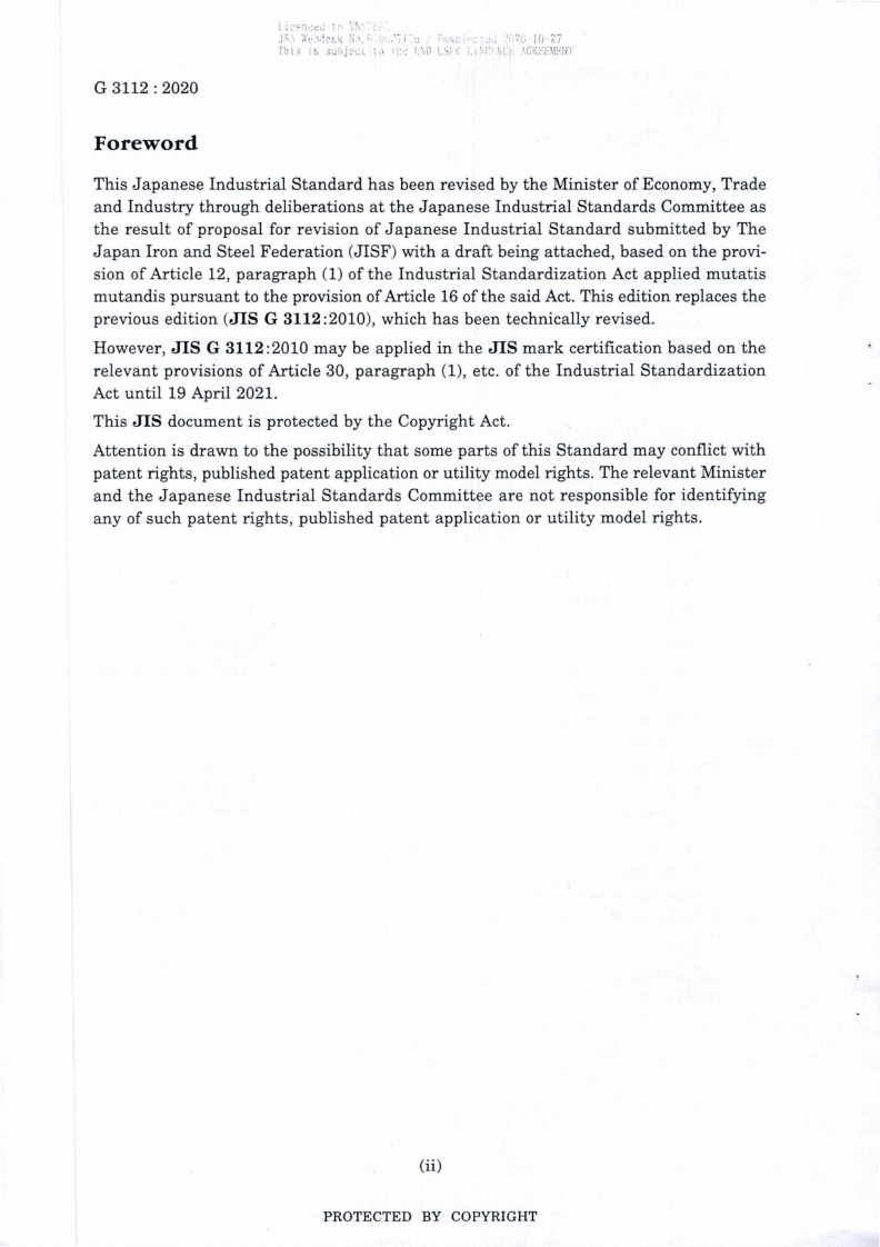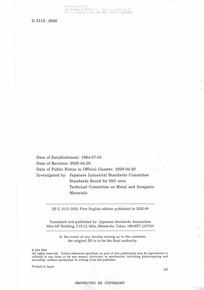 Iteeneed to VF!JSA Reesk.9u027175/4i:d:520-107This is aubjcct to the AYD LS%R LINCEACE AGRFFJISJAPANESEINDUSTRIALCTY TNHH MTV THEP MIEN NAM-VNSTEELSTANDARDTai lieu kiem soatTranslated and Published byJapanese Standards AssociationTIS G 31122020Add:Hongu Viet,Cau aiay.HN(TISF)ISMOTet04-437564268,Fax84-438361556Website:www.ismq.org.vnSteel bars for con md yireinforcementCenter for Standards,Metrology and QualityICS77.140.15;91.080.40Reference number JIS G 3112:2020(E)PROTECTED BY COPYRIGHT13S