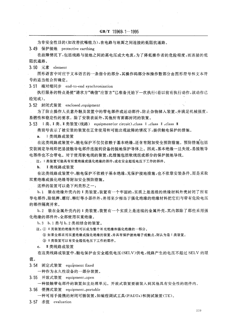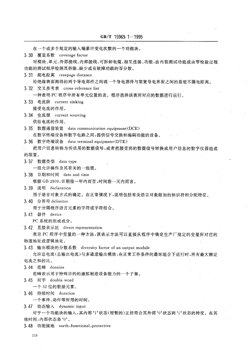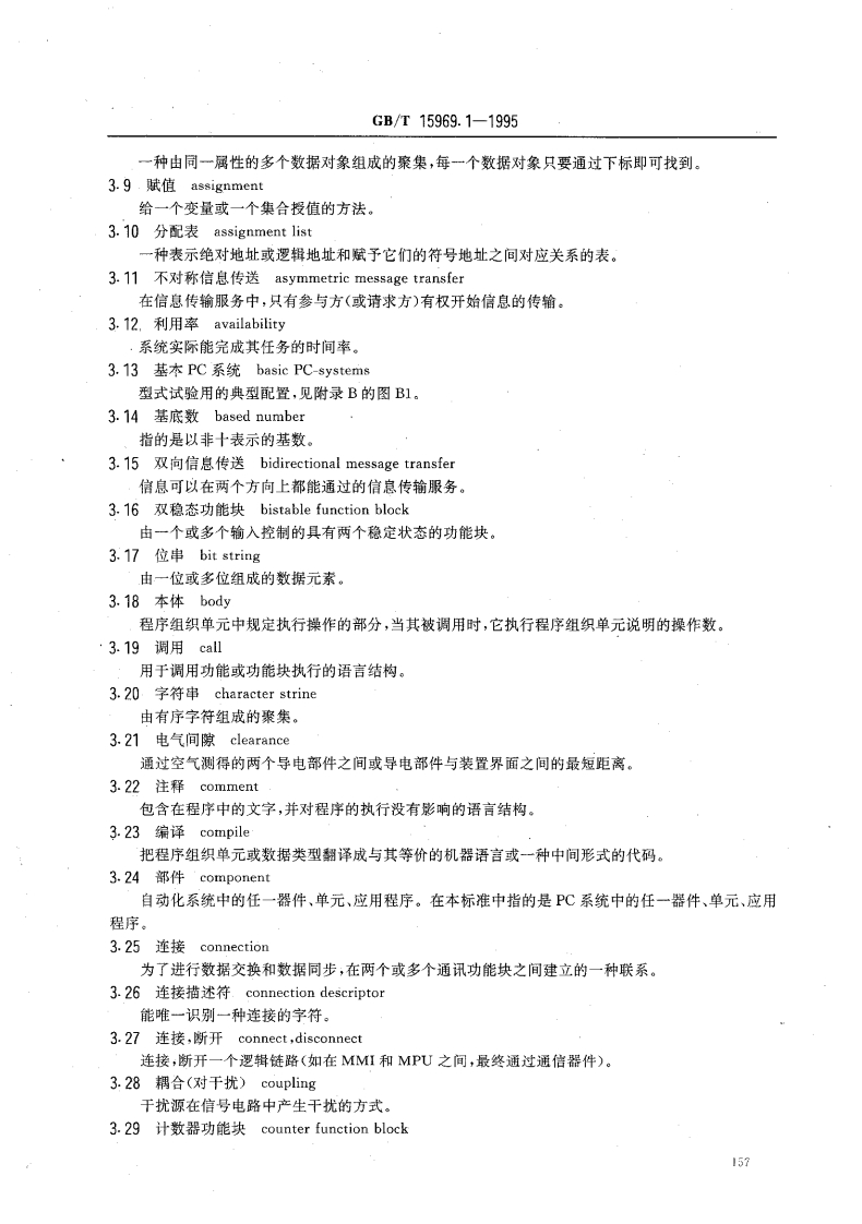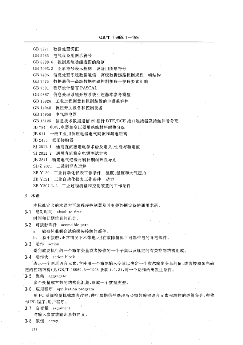 标准分享网www.bzfxw.com中华人民共和国国家标准可编程序控制器第1部分:通用信息GB/T15969.1-1995Programmable controllersPart 1:Grneral information1主题内容与适用范围本标准规定了可编程序控制器及其有关外围设备所用术语的定义。本标准适用于可编程序控制器及其有关的外围设备,如编程和调试工具(PADT)、试验装置(TE)和人-机接口(MMI)等。本标准适用于由可编程序控制器及其有关外围设备组成的控制系统。2引用标准GB156标准电压GB311.3.高电压试验技术,第二部分:试验程序GB1988信息处理信息交换用七位编码字符集GB2311信息处理七位和八位编码字符集代码扩充技术GB2312.信息交换用汉字编码字符集基本集GB2421电工电子产品基本环境试验规程总则GB2422电工电子产品基本环境试验规程名词术语GB2423.1电工电子产品基本环境试验规程试验A:低温试验方法GB2423.3电工电子产品基本环境试验规程试验C:恒定湿热试验方法GB2423.4电工电子产品基本环境试验规程试验Db:交变湿热试验方法GB2423.5电工电子产品基本环境试验规程试验Ea:冲击试验方法GB2423.8电工电子产品基本环境试验规程试验Ed:自由跌落试验方法GB2423.10电工电子产品基本环境试验规程试验F℃:振动(正弦)试验方法GB2423.22电工电子产品基本环境试验规程试验N:温度变化试验方法GB3453.数据通信基本型控制规程GB4207,固体绝缘材料在潮湿条件下相比漏电起痕指数和耐漏电起痕指数的测定方法GB4208外壳防护等级的分类GB4706.1家用和类似用途电器的安全通用要求GB4728电气图用图形符号GB4793电子测量仪器安全要求GB4942.2低压电器外壳防护等级GB4943信息技术设备(包括电气事务设备)的安全GB5261文字和符号成型设备用的增补控制功能国家技术监督局1995-12-29批准1996-10-01实施155