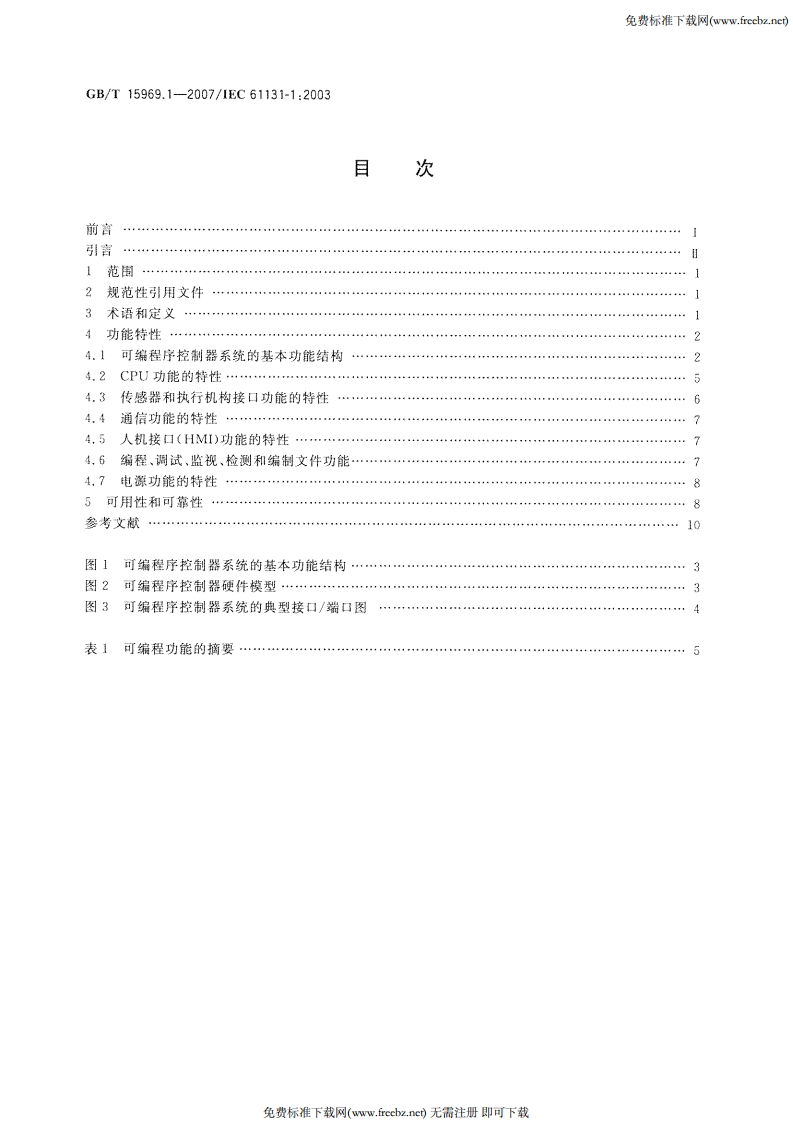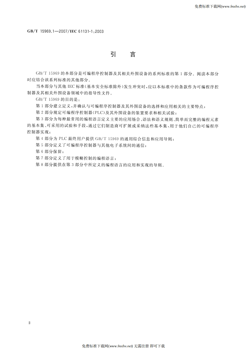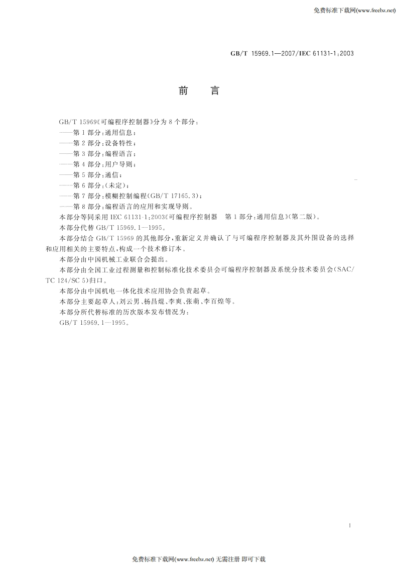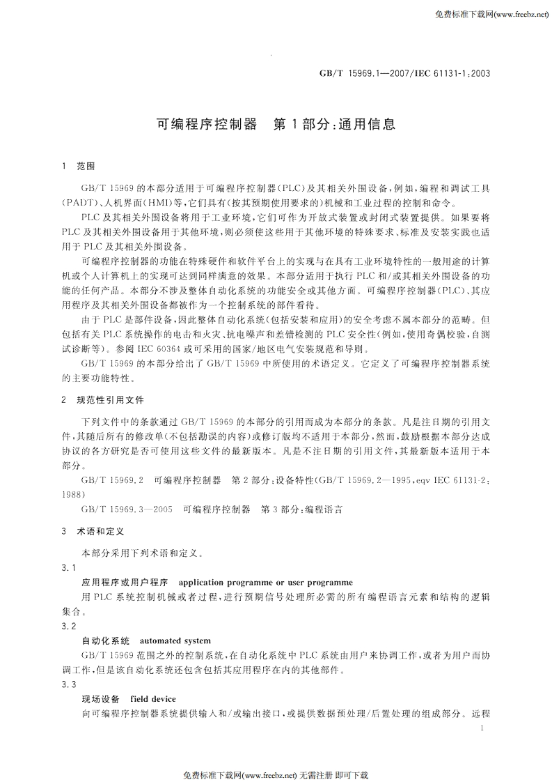 免费标准下载网(w.freebz.nc)1CS25.040.40:35.240.50N 18中华人民共和国国家标准GB/T15969.1一2007/EC61131-1:2003代替(GB/T15969.11995可编程序控制器第1部分:通用信息Programmable controllers-Part 1:General information(IEC61131-1:2003,IDT)2007-10-11发布2007-12-01实施中华人民共和国国家质量监督检验检疫总局发布中国国家标准化管理委员会免费标准下载网(www.freebz.nc)无需注册即可下载