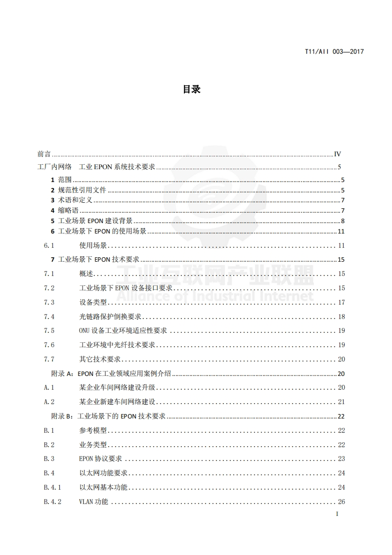 工业互联网产业联盟Alliance of Industrial Internet工业互联网产业联盟标准A11/003-2017工厂内网络工业EPON系统技术要求Factory internal network,TechnicalRequirements of Industrial EPON工业互联网产业联盟(2017年11月21日发布)