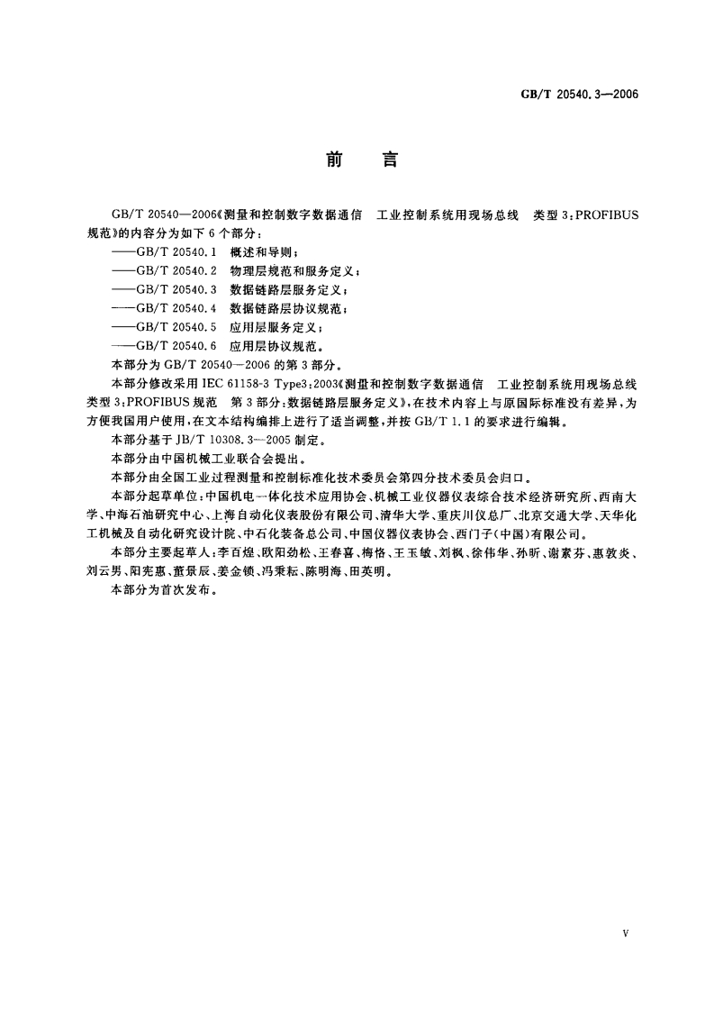 ICS25.040N10中华人民共和国国家标准GB/T20540.3-2006测量和控制数字数据通信工业控制系统用现场总线类型3:PROFIBUS规范第3部分:数据链路层服务定义Digital data communication for measurement and control-Fieldbus for use in industrial control systems-Type 3:PROFIBUS specification-Part 3:Data link layerservice definition(IEC61158-3Type3:2003,MOD)2006-10-16发布2007-05-01实施中华人民共和国国家质量监督检验检疫总局中国国家标准化管理委员会发布