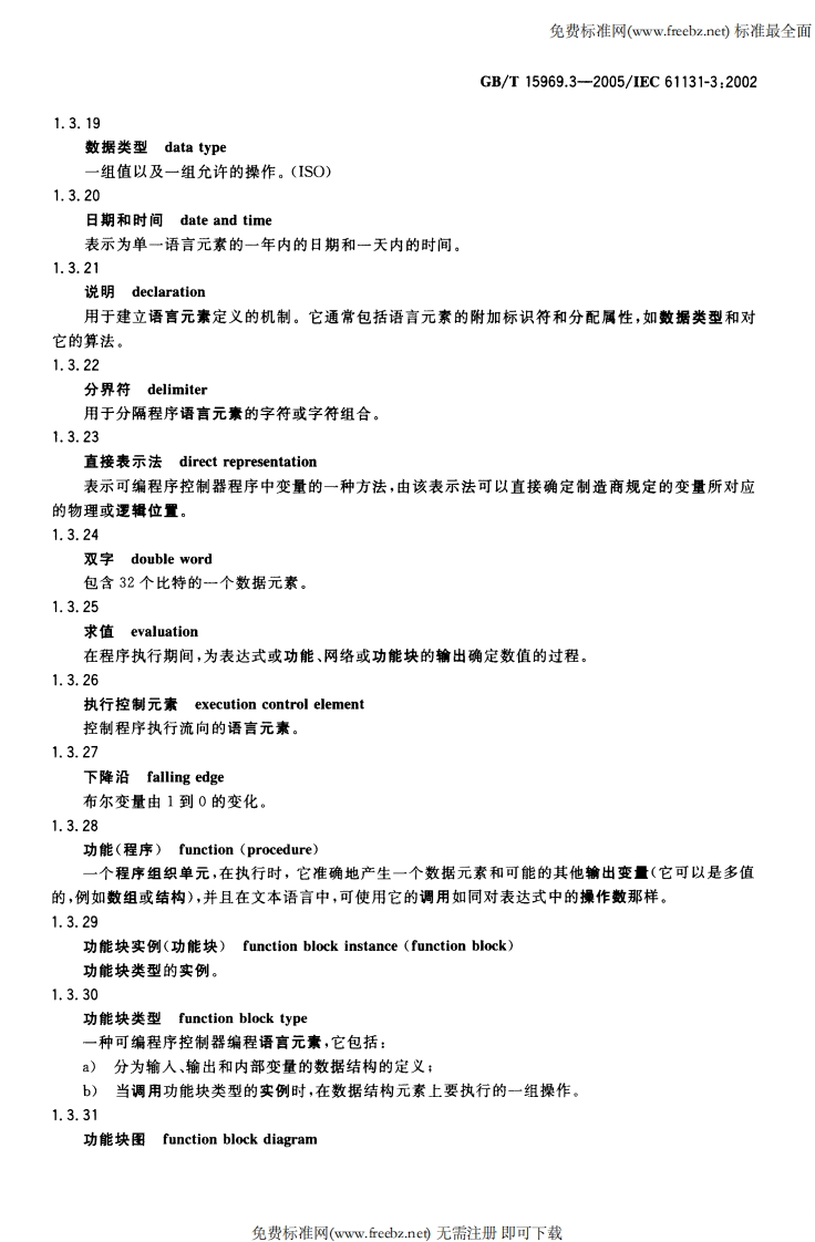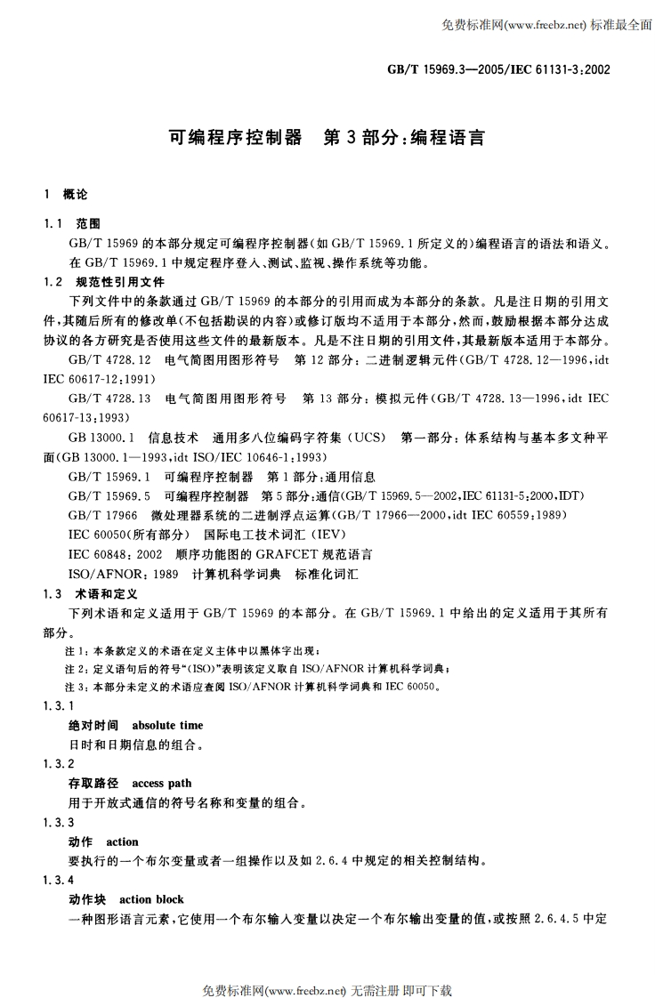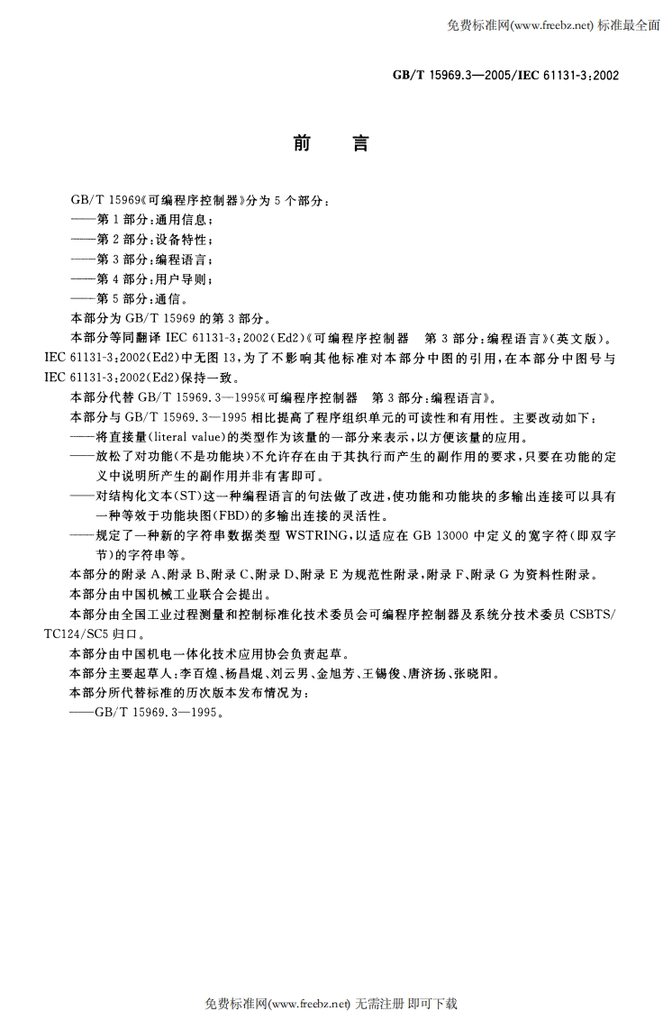 免费标准网(www.freebz.ne)标准最全面N18中华人民共和国国家标准GB/T15969.3-2005/IEC61131-3:2002代替GB/T15969.3一1995可编程序控制器第3部分:编程语言Programmable controllers-Part 3:Programming languages(IEC61131-3:2002,IDT)2005-07-29发布2006-02-01实施中华人民共和国国家质量监督检验检疫总局中国国家标准化管理委员会发布免费标准网(www.freebz.ne)无需注册即可下载