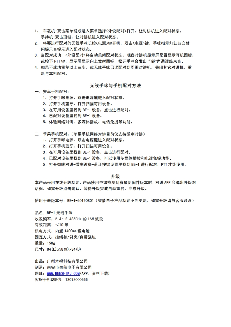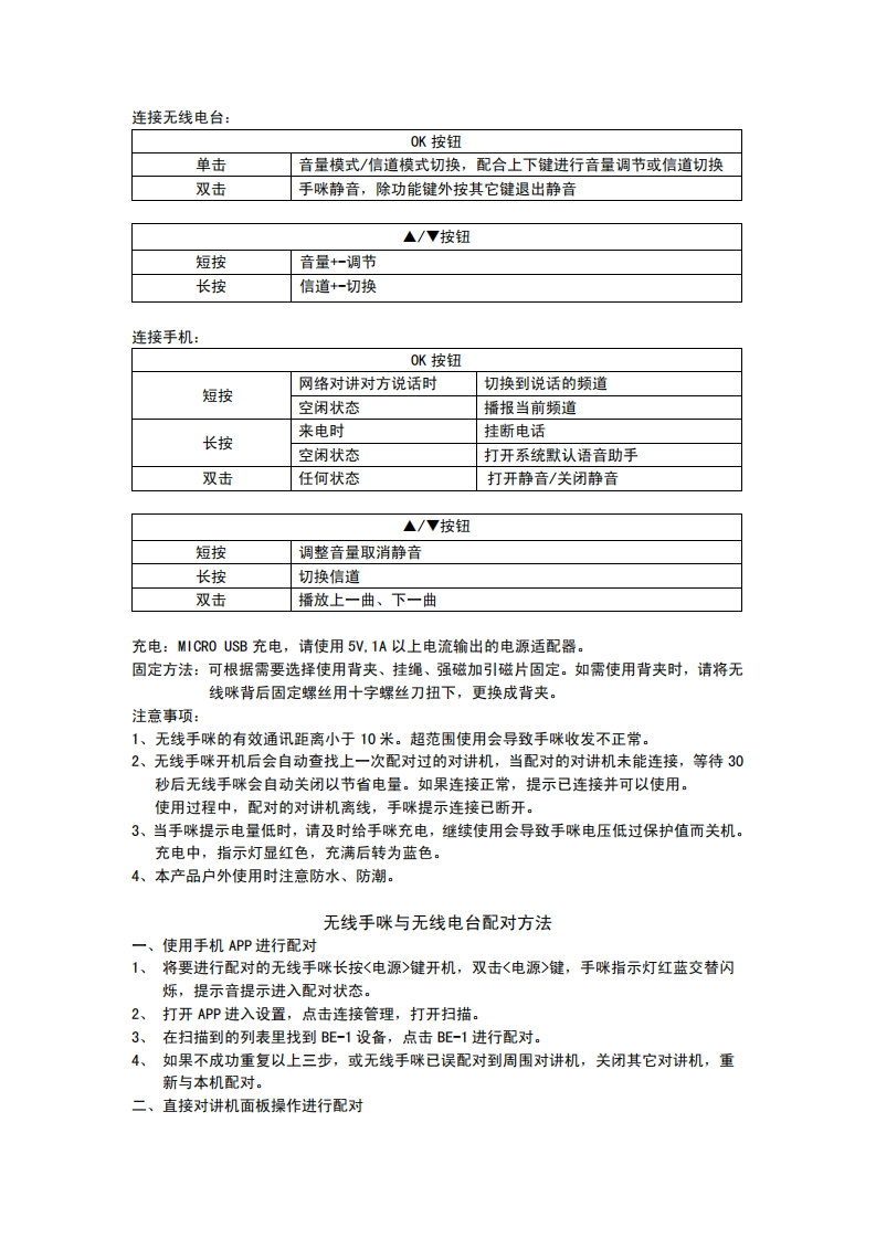 BE-1无线手咪使用说明基本图示:挂绳扣固定螺丝PTT-强磁电源/功能键⑧a▣下键0K键上键BE-1背夹MICR0USB充电恢复出厂设置:开机状态同时按住电源键和0水键,“嘟”声恢复出厂设置并进入配对状态。按键功能介绍:(不同便用场景按键功能定义有所不同)电源按钮长按开机开/关机双击未连接手机或主设备进入蓝牙配对状态已连接手机进入与微喇PTT按键配对状态(苹果手机)单击播放/暂停LED状态红灯蓝灯未连接设备慢闪低电压报警快闪双击进入配对状态交替闪交替闪当与对讲设备配对成功后双闪与设备未连接双闪音乐播放状态渐变静音状态慢闪慢闪PTT按钮按下发送状态,并退出静音状态释放接收状态电话状态:OK按钮来电接听电话短按通话中挂断电话