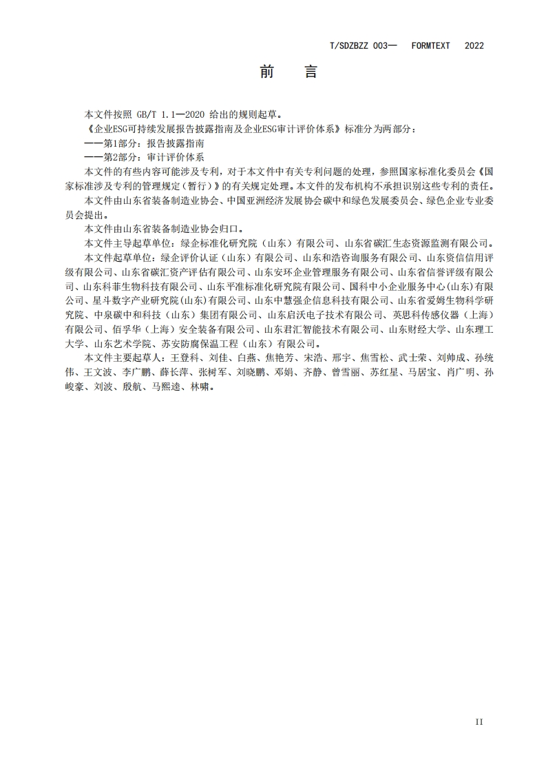 ICS03.100CCS A 00TSDZBZZ山东省装备制造业协会团体标准T/SDZBZZ 003-2022企业ESG可持续发展报告披露指南及企业ESG审计评价体系第2部分:审计评价体系Guidelines for disclosure of enterprise ESG sustainable development reporting andauditing evaluation system of enterprise ESGPart2:audit evaluation system(报批稿)XXXx-XX-XX发布XXxX-Xx-XX实施山东省装备制造业协会发布