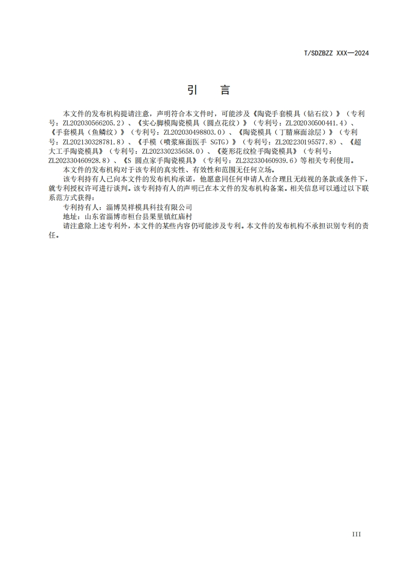 陶瓷质模具Ceramicmolds(报批稿)348072@abc10天前发布关注私信1.18MB9页030免费资源陶瓷质模具Ceramicmolds(报批稿)资源下载123云盘123云盘提示:操作频繁,请稍后再试 第1页 / 共9页 第2页 / 共9页 第3页 / 共9页 第4页 / 共9页 第5页 / 共9页 该文档为免费文档,您可直接下载完整版进行阅读 THE END标准规范 文本预览 ICS53.080CCS J83U/SDZBZZ团体标准T/SDZBZZ XXX-2024陶瓷质模具Ceramic molds(报批稿)XXXX-Xx-XX发布XXXX-Xx-XX实施山东省装备制造业协会发布 查看更多 收起部分 喜欢就支持一下吧收藏