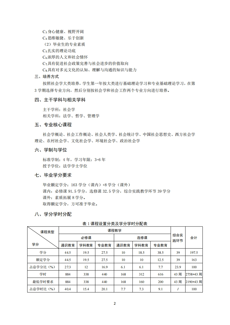 社会学专业培养方案专业代码:030301专业名称:社会学一、培养目标1.基本培养目标培养的学生身心健康、知识结构合理,有健全的人格、高尚的人文情怀和社会责任感,有一定的批判思维与创新能力、科学研究能力、沟通交流能力、终身学习能力和组织管理能力,具有国际视野和团队合作精神。2.专业培养目标培养熟练掌握社会学基础理论知识和基本社会调查技能,具备较强的知识运用能力和扎实的社会实践能力,能够在政府、企事业单位和社会组织等机构从事调查、研究和管理等相关工作的复合型人才。二、毕业要求1.知识结构要求(1)毕业生应掌握的基本知识A1历史、哲学、文学、艺术等领域的基本知识A2社会科学学科研究方法的基本知识A3数理与逻辑分析知识A,现代信息技术的基本知识A5生态环境、生命科学、经济管理等方面的基本知识(2)本科生应掌握的专业知识A6.具备社会学专业基础知识A7.具备社会学分支学科的基本知识和研究方法Ag.掌握哲学、法学等相关学科基本理论知识2.能力结构要求(1)基本能力B1语言表达能力B2发现、分析和解决问题的能力B3批判性思维、创造性工作以及终身学习的能力B:组织、管理与领导能力B5分辩与鉴赏能力(2)专业能力B:运用社会学理论和方法认识社会现象的能力B,独立开展社会调查及数据处理的能力B&公文及专业论文写作能力3.素质结构要求(1)毕业生的基本素质C1志存高远、意志坚强C2刻苦务实、精勤进取1