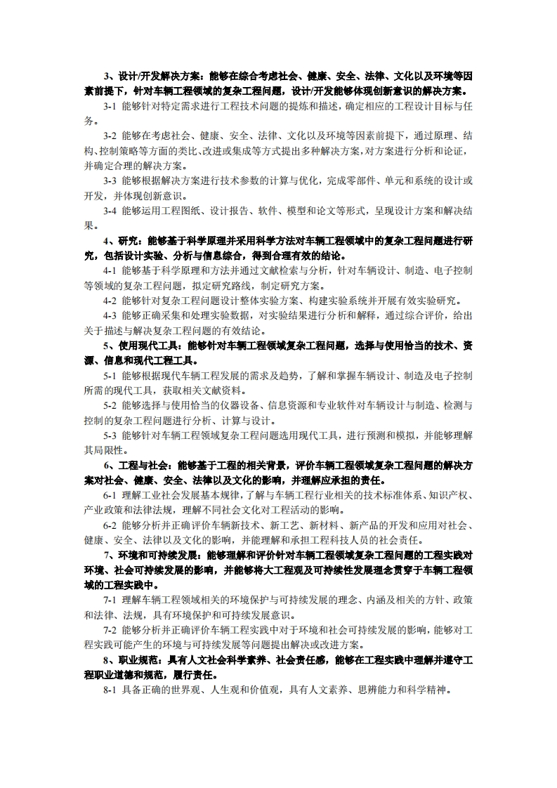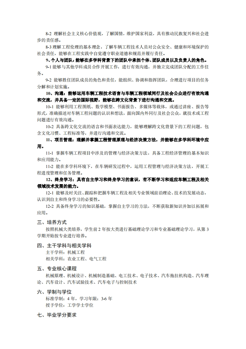 车辆工程专业培养方案专业代码:080207专业名称:车辆工程一、培养目标本专业培养身心健康、知识结构合理,有健全的人格、高尚的人文情怀和社会责任感,有一定的批判思维与创新能力、科学研究能力、沟通交流能力、终身学习能力和组织管理能力,具有国际视野和团队合作精神,掌握车辆工程领域扎实的基础理论及系统的专业知识,具备在车辆设计、制造、电子控制等领域进行设计与工程研发能力,具有领军素养,能够从事汽车、拖拉机等领域科学研究、技术开发、工程应用与组织管理的高素质复合应用型人才。学生毕业5年后,预期达到以下目标:1.知识能力:具有宽厚的数学、自然科学和工程基础知识,能综合应用基础知识、专业知识以及现代设计工具,解决车辆工程领域相关技术和产品的研究、设计、开发、测试和管理等复杂工程问题。2.职业规范:树立工程师科学道德规范与伦理责任,能够有效地将安全、行业规范、技术标准、法律法规、环境、文化等非技术因素,进行综合考量来解决复杂工程问题,在工程项目实践中能坚持公众利益优先原则。3.团队精神:能够与他人进行有效交流沟通,与他人展开合作,具备在团队中行使职责的能力:能够在跨领域、跨文化环境中工作,并能够发挥有效作用。4.国际视野:具有国际视野和跨文化的交流与合作能力,熟悉行业的国内外发展现状,了解行业发展趋势。5.终身学习:具有自主学习和自我完善的能力,能够跟踪车辆工程及相关专业领域前沿理论、技术,获取新知识并加以消化吸收,以适应社会发展需求。二、毕业要求1、工程知识:系统地掌握数学、自然科学、工程基础和车辆工程领域的专业知识,能够综合应用上述知识解决车辆设计、制造、电子控制等领域中的复杂工程问题。1-1系统地掌握相关的数学知识,并能将其应用于分析车辆工程领域的复杂问题,并能用数学语言表述。1-2掌握相关的物理、化学等自然科学基础,并能将其应用于分析车辆工程领域的复杂问题,并能恰当表述。13掌握车辆设计、制造、电子控制等相关工程基础知识,并能够应用其基本概念、基本理论和基本方法对研究对象进行建模、求解与分析。1-4掌握车辆工程领域的专业知识,能将其与数理基础和工程基础等知识相结合,综合应用于解决车辆设计、制造、检测与控制等复杂工程问题。2、问题分析:能够对现代车辆设计、制造及电子控制等领域复杂工程问题,进行识别和表达,并通过文献研究分析复杂工程问题,获得有效结论。2-1能够应用数学、自然科学和工程科学的基本原理和方法,对车辆设计、制造、电子控制等领域的复杂工程问题进行识别和判断。22能够通过文献研究、分析、实验或实践,理解解决方案的多样性与局限性,并提出相应的解决方案。23能够对复杂工程问题的影响因素和关键环节(要素)等进行分析和比较,证实解决方案的合理性,并获得有效结论。