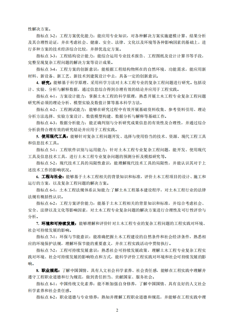土木工程专业培养方案专业代码:081001专业名称:土木工程一、培养目标1基本培养目标培养的学生身心健康、知识结构合理,有健全的人格、高尚的人文情怀和社会责任感,有一定的批判思维与创新能力、科学研究能力、沟通交流能力、终身学习能力和组织管理能力,具有深厚爱国情怀、国际视野和团队合作精神,德智体美劳全面发展。2.专业培养目标培养具有扎实的自然科学基础,掌握土木工程学科的基本理论和基本知识,获得工程师基本训练,具有利用所学专业知识创造性解决土木工程领域中存在的复杂工程问题,具有初步的土木工程设计、项目管理及创新能力的复合型高级工程技术人才。毕业生能从事建筑、道路、桥梁等土木工程的设计、施工、管理、咨询、监理和研究等工作,毕业后五年左右达到与土木工程类执业资格相当水平,成为土木工程及相关领域的技术骨干或高级管理人员。二、毕业要求1,工程知识:能够将数学、自然科学、工程基础和专业知识用于解决土木工程专业的复杂工程问题。指标点1-1:逻辑推理能力:系统掌握数学与自然科学知识和逻辑推理的基本技能,通过数据演算,归纳总结相应的逻辑结论,能应用于土木工程专业复杂工程问题的分析、抽象、建模及求解。指标点12:工程建模能力:系统掌握力学、结构等基础知识,能将这些力学基础知识应用到土木工程专业复杂工程问题的分析、建模和计算。指标点13:工程结构认知能力:系统掌握工程基础知识,能将这些工程基础知识用于土木工程专业复杂工程问题的基础性表述、分析、计算和评价。指标点14:工程建造能力:系统掌握专业基础知识和专业知识,能将这些专业知识用于拟定土木工程复杂工程问题的解决方案以及各种方案的综合比较。2.问题分析:能够应用数学、自然科学和工程科学的基本原理,识别、表达、并通过文献研究分析土木工程专业的复杂工程问题,以获得有效结论。指标点2-1:工程识别能力:能运用数学和自然科学知识的基本原理,识别、表达、并通过文献研究分析土木工程专业的复杂工程问题,以获得有效结论。指标点22:设计表达能力:能应用工程科学的基本原理,并结合实际工程建设的基本特点,对土木工程专业复杂工程问题的影响因素和各种可行方案进行系统分析与充分表达。指标点23:工程分析能力:能应用数学、自然科学和工程科学的基本原理分析土木工程专业复杂工程问题,能广泛查阅行业标准和相关文献资料获取并利用最新科技成果,对复杂工程问题的影响因素及解决方案进行分析。3.设计开发解决方案:能够设计(开发)满足土木工程特定需求的体系、结构、构件(节点)或者施工方案,并在设计环节中考虑社会、健康、安全、法律、文化以及环境等因素。在提出复杂工程问题的解决方案时具有创新意识。指标点31:工程环境认知能力:能结合实际工程建设的基本特点,基于地质、施工、管理与运行等工程建设的基本条件,提出并拟定满足土木工程特定需求的构件、结构、体系或施工的可行1