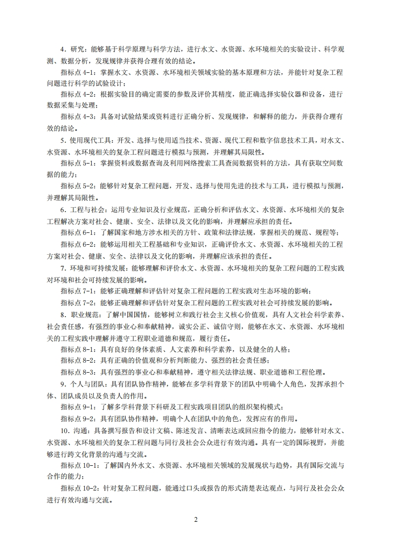水文与水资源工程专业培养方案专业代码:081102专业名称:水文与水资源工程一、培养目标1.基本培养目标培养的学生身心健康、知识结构合理,有健全的人格、高尚的人文情怀和社会责任感,有一定的批判思维与创新能力、科学研究能力、沟通交流能力、终身学习能力和组织管理能力,具有深厚爱国情怀、国际视野和团队合作精神,德智体美劳全面发展。2.专业培养目标培养具有扎实的水文与水资源工程专业系统理论、宽厚的自然与人文科学知识,富有开创精神,能够在水利、农林、生态、环保、城建、国土、地矿、防灾减灾等领域胜任水文、水资源和水环境等方面的勘测、评价、规划、设计、开发利用、预测预报及管理等工作的创新型和复合型高级专门人才。学生毕业后五年左右,具备工程师或与之相当的专业技术能力,能够在工作团队中作为核心成员或领导者有效地发挥作用,并发展成为学术精英或行业领军人才。二、毕业要求1.工程知识:掌握数学、自然科学、工程基础知识,水文、水资源、水环境专业知识,并能应用于解决复杂工程问题。指标点1-1:掌握数学、自然科学的基本理论与基本方法,并应用于表0述复杂工程问题:指标点1-2:掌握力学、工程制图、工程测量等工程基础知识,并应用于解决复杂工程问题:指标点1-3:掌握计算机、程序设计语言等基础知识,能针对复杂工程系统构建恰当的数学模型,并对模型进行推理和求解:指标点1-4:掌握水文、水资源、水环境等专业知识,能够正确评价与解决工程建设中的相关问题。2.问题分析:能够应用数学、自然科学和水利学科的基本原理,通过国内外文献检索与研究,分析水文、水资源、水环境相关的复杂工程问题,并进行正确识别与表达。指标点2-1:利用数学与自然科学知识,对水文、水资源、水环境复杂工程问题进行参数识别与模型表达,并满足精度要求:指标点2-2:通过国内外文献查阅与研究,获得解决问题的多种方法,并分析确定合理的方法:指标点2-3:能运用工程科学的基本原理,针对水文、水资源、水环境复杂工程问题,分析影响因素,正确表达工程问题的关键环节及其解决方案。3.设计开发解决方案:能够针对水文、水资源、水环境相关的复杂工程问题,考虑社会、健康、安全、法律、文化以及环境等因素,提出具有创新意识的设计解决方案。指标点3-1:掌握满足特定需求的水文、水资源、水环境相关复杂工程问题的设计方法:指标点3-2:能够运用专业知识,进行水文、水资源、水环境相关项目设计,编写符合规范要求的设计报告:指标点3-3:设计环节中体现创新意识,并能够考虑经济、环境、法律、伦理等各种制约因素,进行不同设计方案的比选和优化,论证解决方案的合理性和可行性。1