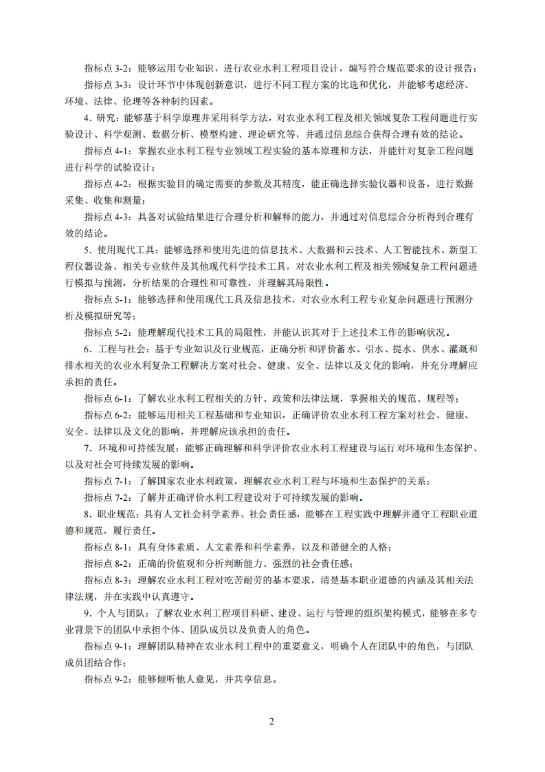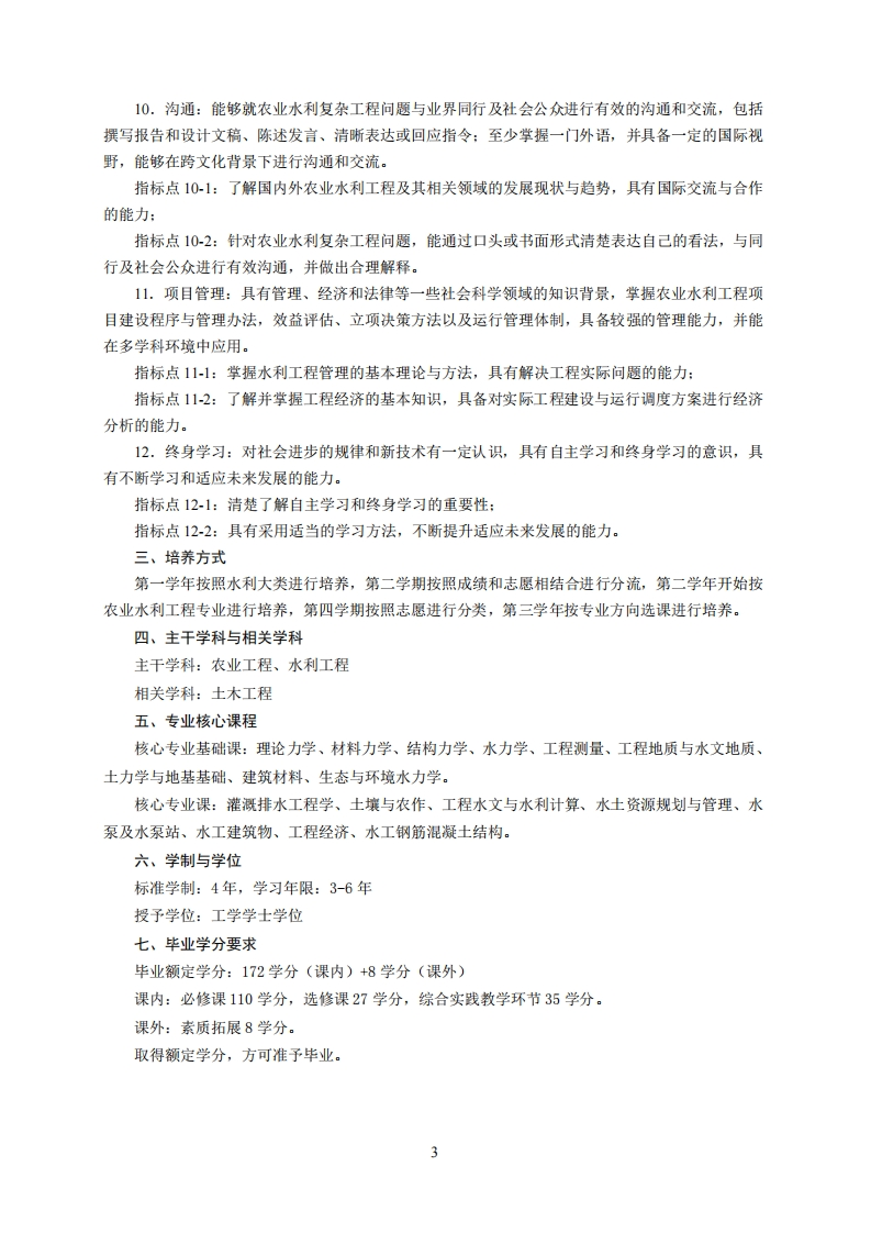 农业水利工程专业培养方案专业代码:082305专业名称:农业水利工程一、培养目标1.基本培养目标培养的学生身心健康、知识结构合理,有健全的人格、高尚的人文情怀和社会责任感,有一定的批判思维与创新能力、科学研究能力、沟通交流能力、终身学习能力和组织管理能力,具有深厚爱国情怀、国际视野和团队合作精神,德智体美劳全面发展。2.专业培养目标培养具有农业工程与水利工程学科的基础理论、基本知识和基本技能,能在农业、水利、水电、水保、建筑等行业从事农业水利工程的勘测、规划、设计、施工、研究、管理及水土资源开发与利用等方面工作的创新型和复合型农业水利工程建设与管理的高级专门人才。毕业后五年左右能够成为农业水利工程及相关领域的学术、技术或管理骨干,并获得工程师职称或者具备相当水平的工作能力,发展成为学术精英或行业领军人才。二、毕业要求1.工程知识:掌握数学、自然科学、工程基础,以及与蓄水、引水、提水、供水、灌溉和排水相关的专业知识,并能应用于解决复杂农业水利工程问题。指标点1-1:掌握数学、自然科学的基本理论与基本方法,并能将其应用于对农业水利工程复杂问题的适当表述:指标点1-2:掌握力学、工程制图与CAD、工程测量、地质等工程基础知识,能将其用于农业水利工程的规划、勘测、设计和施工等:指标点1-3:掌握计算机、MATLAB等基础知识,能针对复杂工程系统选择恰当的数学模型,并对模型进行推理和求解:指标点1-4:掌握工程水文、建筑材料、土壤与农作学以及蓄水、引水、提水、供水、灌溉和排水等专业知识,能够正确评价与解决农业水利工程建设中的相关问题。2.问题分析:能够应用数学、自然科学、农业工程和水利工程学科的基本原理,通过国内外文献检索与研究,分析蓄水、引水、提水、供水、灌溉和排水相关的复杂工程问题,并进行正确识别与表达。指标点2-1:利用数学与自然科学知识,对农业水利复杂工程问题进行参数识别与模型表达,并满足适当的精度要求:指标点2-2:通过文献查阅与分析,获得解决问题的多种方法,并分析确定适当方法:指标点23:能运用工程科学的基本原理,针对一个复杂的农业水利问题,分析影响因素,正确表达工程问题的关键环节及其解决方案,证明解决方案的可行性和合理性。3.设计/开发解决方案:能够针对蓄水、引水、提水、供水、灌溉和排水等农业水利工程复杂问题,考虑社会、健康、安全、法律、文化以及环境等因素,提出具有创新意识的设计、开发解决方案。指标点3-1:掌握满足特定需求的农业水利工程设计方法: