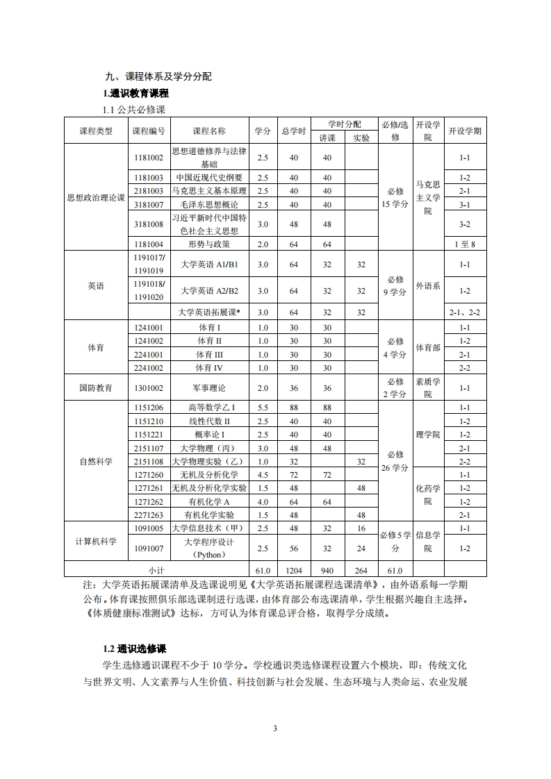 农学专业培养方案专业代码:090101专业名称:农学一、培养目标1.基本培养目标培养的学生身心健康、知识结构合理,有健全的人格、高尚的人文情怀和社会责任感,有一定的批判思维与创新能力、科学研究能力、沟通交流能力、终身学习能力和组织管理能力,具有国际视野和团队合作精神。2.专业培养目标本专业培养能够适应并推动现代农业发展需要,德、智、体、美、劳全面发展,拥有“三农”情怀,掌握扎实的现代农业基本知识、作物学科基础理论、基本知识和基本技能,具有较强的实验技能、实践能力、创新能力和良好的科学素养,具备解决农业生产实践、农业经营管理复杂问题的能力,能在农业及其它相关部门或单位从事农业科学研究与教学、技术推广与开发、生产经营与管理等工作的拔尖创新型和复合应用型人才。二、毕业要求2.1具有人文底蕴、科学精神、职业素养、社会责任感和“三农”情怀,了解国情社情民情,践行社会主义核心价值观:2.2具有扎实的基础知识和专业知识,掌握必备的研究方法,了解本专业及相关领域最新动态和发展趋势:2.3具有申辩性思维和创新能力。能够正确认识国家粮食安全问题及农业生产可持续发展,能够发现、辨析、质疑、评价本专业及相关领域现象和问题,表达个人见解:2.4有解决农业生产实际问题的能力。具有较强的实践能力,能够对本专业领域实际问题进行综合分析和研究,并提出相应对策或解决方案:2.5有信总技术应用能力。能够恰当应用现代信总技术手段和工具解决实际问题:2.6具有较强的沟通表达能力。能够通过口头和书面表达方式与同行、社会公众进行有效沟通:2.7具有良好的团队合作能力。能够与团队成员和谐相处,协作共事,并作为成员或领导者在团队活动中发挥积极作用:2.8具有国际视野和国际理解能力。了解本专业领域国际动态和发展趋势,关注全球重大问题,理解和尊重世界不同文化的差异性和多样性,积极参与国际交流与合作:2.9具有终身学习意识和自我管理、自主学习能力。能够通过不断学习,适应社会和个人持续发展。三、培养方式按照大类招生分类培养的“2+2”人才培养模式,学生在前四学期不分专业,按照大类进行基础理论学习和专业基础理论学习,修读相应的课程并获得学分。第五学期分流到相应专业,按照专业方向进行培养。四、主干学科与相关学科