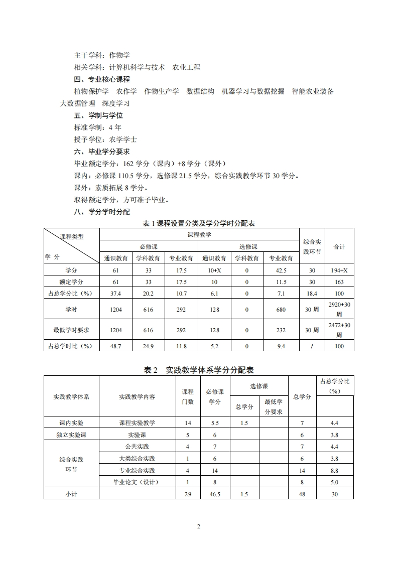 智慧农业专业培养方案专业代码:090112T专业名称:智慧农业一、培养目标1.基本培养目标培养的学生身心健康、知识结构合理,有健全的人格、高尚的人文情怀和社会责任感,有一定的批判思维与创新能力、科学研究能力、沟通交流能力、终身学习能力和组织管理能力,具有国际视野和团队合作精神。2.专业培养目标本专业致力于服务国家农业农村现代化发展战略需求,培养德、智、体、美、劳全面发展,拥有深厚的人文底蕴、三农情怀,掌握扎实数理基础和专业知识,具有较强的实验技能、实践能力、创新能力和良好的科学素养,能将信息技术、现代工程技术、现代经营管理知识与农学有机融合,具备解决农业生产实践、农业经营管理复杂问题的能力,能胜任现代农业新型经营主体、现代农业科技园区和乡村治理及相关领域的教学科研、产业规划、经营管理、技术服务等工作的高素质复合型卓越人才。二、基本要求1.具有坚定正确的政治方向、良好的道德修养和健全的人格,拥护中国共产党的领导,坚持中国特色社会主义制度,具有高度社会责任感,自觉践行社会主义核心价值观。2.拥有“一懂两爱”的“三农”情怀,树立和践行“绿水青山就是金山银山”的生态文明与可持续发展理念。3.具有扎实的理学基础知识、专业基础知识和科学思维能力,具有深厚的人文底蕴、求真务实的科学精神和良好的职业素养。4.具有申辩性思维和创新能力。能够发现、辨析、质疑、评价本专业及相关领域的现象和问题,能提出科学合理的个人见解:具有创新创业意识,能够将创新思维和创业精神在创新创业活动中付诸实践。5.具备解决未来农业生产实际问题的能力。掌握智慧农业领域必备的研究方法,具有较强的实践能力,能够对本专业领域实际问题进行综合分析和研究,并提出相应的对策或解决方案。6.具有较强的沟通表达能力。能够通过口头和书面表达方式与同行、社会公众进行有效沟通:7.具有良好的团队合作能力。能够与团队成员和谐相处,协作共事,并作为成员或领导者在团队活动中发挥积极建设性作用。8.具有国际视野和国际理解能力。掌握智慧农业领域国际动态和发展趋势,能够关注世界粮食安全、食品安全、生态安全、人类营养与健康等重大国际发展问题,理解和尊重世界不同文化的差异性和多样性,积极参与国际交流与合作。9.具备终身学习意识,自我管理和自主学习能力强,通过不断学习、持续发展,具有成为智慧农业及相关行业领军人才或骨干人才的潜质。三、主干学科与相关学科