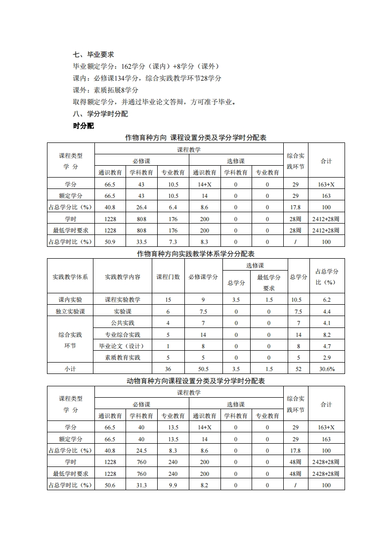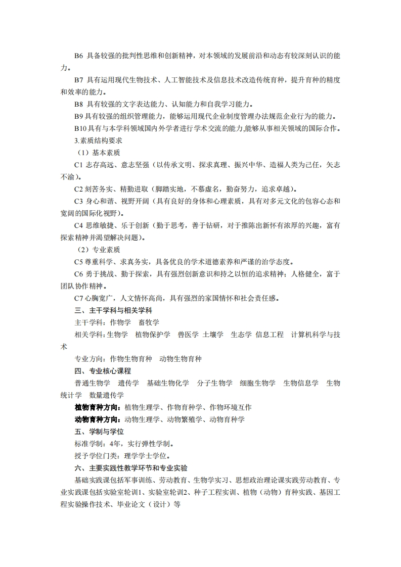 生物育种科学专业代码:090116TK专业名称:生物育种科学一、培养目标1.基本培养目标培养的学生身心健康、知识结构合理,有健全的人格、高尚的人文情怀和社会责任感,有一定的批判思维与创新能力、科学研究能力、沟通交流能力、终身学习能力和组织管理能力,具有国际视野和团队合作精神。2.专业培养目标坚持社会主义办学方向,以立德树人为根本任务,以服务国家粮食、肉类安全、农业绿色生产与可持续发展为目标,立足现代生物育种产业发展需求,聚焦动植物种业卡脖子等关键技术攻关,培养具有全球视野和家国情怀,专业基础扎实、综合素养高、创新意识强,能将现代生物技术、信息技术、管理知识与种业科技发展相结合,富有创新创业精神和国际视野的现代种业卓越人才。二、毕业要求1.知识结构要求(1)基本知识A1掌握历史、哲学、文学、艺术等领域的基本知识,培养学生具有正确的历史观、世界观、人生观、价值观、审美观。A2掌握社会科学的基本知识,了解基本研究方法,具有人文情怀和社会责任感。A3掌握数理与逻辑分析以及生物学的基础知识。A4掌握现代信息技术的基本知识,培养学生具有应用现代网络技术和信息处理技术等的基本能力。A5培养学生掌握生态环境与人类命运、科技创新与社会发展、传统文化与世界文明等方面的基本知识。(2)专业知识A6掌握数理基础、生物学、化学、计算机与信息技术基础知识。A7掌握遗传学、动植物育种学、动植物生产学、生物信总学、种子(动物)繁育及检验的基础理论知识和实践技能。A8掌握现代遗传学、分子生物学、生物统计学、数量遗传学、智能育种等领域知识。2.能力结构要求(1)基本能力B1清晰思考和用语言文字准确表达的能力。B2发现、分析和解决问题的能力。B3批判性思考、创造性工作以及终身学习的能力。B4组织、管理与领导能力,与人合作共事的能力。B5对文学艺术作品的基本鉴赏能力。(2)专业能力