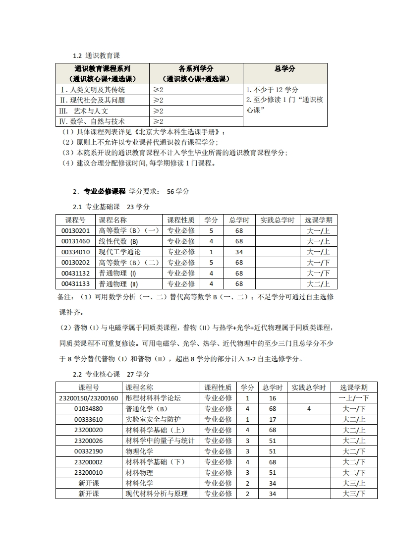 北京大学工学院材料科学与工程专业培养方案一、专业简介材料科学与工程专业是现代工科的重要分支,属工学门类一级学科。北京大学材料学科是学校最早进入ES1全球大学和科研机构排名前1%的学科,首批入选教育部双一流学科建设名单,为国家培养在先进碳材料、新结构材料、新能源材料、生命健康材料、光电子材料等前沿方向上的科学和工程技术人才。2005年,工学院成立先进材料与纳米技术系:2012年更名为材料科学与工程系。2020年,学校整合全校材料科学与工程相关专业成立材料科学与工程学院,这是学校为实施“新工科”发展战略设立的学校直属实体教学科研单位。目前,本专业学生由材料学院与工学院共同培养。材料科学与工程学院现有全职教师50余人(含深圳研究生院相关教师),其中两院院士4人,长江特聘教授4人、国家特聘专家3人,国家杰出青年基金获得者12人、国家重点研发计划首席8人,国家级青年人才30人。同时,拥有CT几国家级重点实验室、先进碳材料教育部高等学校学科创新引智基地、国家大宗工业固废及资源化产品质量监督检验中心、9个省部级重点实验室/中心、5个研究所、4个校级平台,具有良好的教学和科研条件。二、培养目标本专业紧密结合国家战略需求,注重多学科交叉融合与实际应用,致力于从全方位培养一专多能的科学与工程“双语者”,能够在材料科学与工程领域内进行科学研究和技术创新的应用型工程技术人才。学生具备社会责任感及专业素养,可将所学内容融合应用在材料学、化学、材料加工工程等相关领域,具有引领未来发展的能力。同时注重科学思维和系统思维的培养与建构,通过跨学科学习拓宽知识视野,形成更全面、立体的知识体系,从而具备解决复杂工程技术问题的能力。毕业后,可以选择在相关领域继续攻读硕士和博士学位,进而在大学或科研单位从事科学研究工作,也可以到工程技术领域或管理部门从事产品研发或管理工作。三、培养要求本专业培养学生掌握材料科学的基本理论与知识,建立扎实的数理基础,具备基本的实验技能以及广阔的科学视野。通过科研和工程技术应用训练,使其成为可全面发展的复合拔