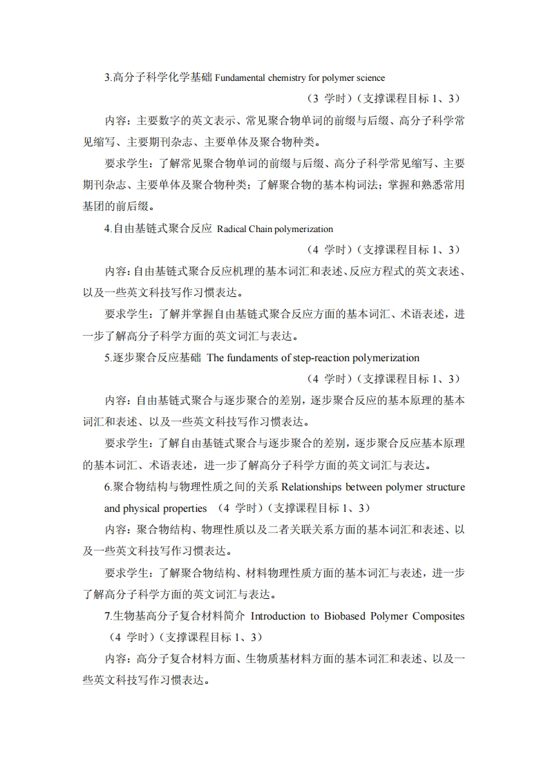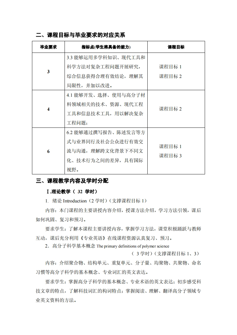 《专业英语》教学大纲课程名称:专业英语课程代码:X100199学分:2学时:32(讲课学时:32实验学时:0课内实践学时:0)课程性质:专业必修课英文名称:Specialized English for Polymer Materials and Engineering选用教材:高振华等.高分子科学导读(英文版).东北林业大学出版社,2005参考书:1.曹同玉等.高分子材料工程专业英语化学工业出版社,20162.揣成智等.高分子材料工程专业英语.中国轻工业出版社,2006开课学期:春季学期适用专业:高分子材料与工程先修课程:大学英语、高分子化学、高分子物理开课单位:材料科学与工程学院一、课程目标通过本课程的学习,学生应具备以下几方面的目标(知识、能力、素质三方面,必须支撑培养方案中的毕业要求)通过本课程的理论教学和翻译写作训练,使学生具备下列能力:1、通过本课程的学习,培养学生对科技词汇认知的能力,使学生熟练掌握主要专业术语及构词方法,掌握专业英语表达的语法特点、翻译技巧,具备理解、翻译高分子材料领域专业资料、科技文献以及产品说明书等的能力:2、通过本课程的学习,培养学生以科技英语为途径,利用现代化信息工具获取高分子材料领域相关信息、资料的能力,使学生具备检索、查阅高分子材料领域英文资料的基本能力,进而对复杂工程问题开展研究,综合信息获得合理有效结论,理解其局限性,并加以改进:3、通过本课程的学习,培养学生以高分子材料领域知识为背景,利用英文专业术语表达高分子材料领域内容,能够以撰写报告、陈述发言等方式,准确表达自己的想法和意图,理解跨文化背景下不同文化、技术行为之间的差异,具有国际视野。