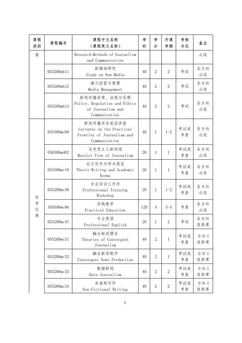 新闻与传播硕士专业学位研究生培养方案(内招)Developing Plan for Master of Journalism andCommunication (MJC)(055200)一、专业方向l.融合新闻Convergent Journalism2.数字营销传播Digital Marketing Communication3.视听传播Audiovisual Communication4.公共传播Public Communication5.国际传播International Communication二、培养目标培养适应新时代中国特色社会主义建设要求,德智体美劳全面发展,满足社会发展对新闻传播工作的多样化需求,掌握丰富的人文社会科学知识和厚实的新闻传播理论,熟悉必备的社会科学研究方法,能胜任融合新闻报道、数字营销传播、视听传播、公共传播、国际传播等领域的全媒型高素质新闻传播人才。具体要求:(一)坚持马克思主义新闻观,具有良好的政治素养和政策水平;遵守法律法规,恪守社会公德、新闻传播职业道德和学术规范;具有强烈的时代认知和高度的社会责任感;具有正确的新闻志向和价值取向,敢于创新,敏于实践,勇于担当。(二)掌握扎实的新闻专业理论知识,具备宽广的哲学人文社科知识素养和从事新闻传播实践所需要的专业素养,能够胜任新媒体环境下传播技术变革对新闻传播工作提出的新要求。(三)具有良好的思辨意识和对知识的分类整理能力、口头和文字表达能力以及社会实践能力和专业实践能力,能满足社会变革、就业竞争和职业发展的需求。(四)掌握一门外语,具有一定的国际视野,能较熟练地阅读本专业的外文文献,具有较强的国际交流能力。