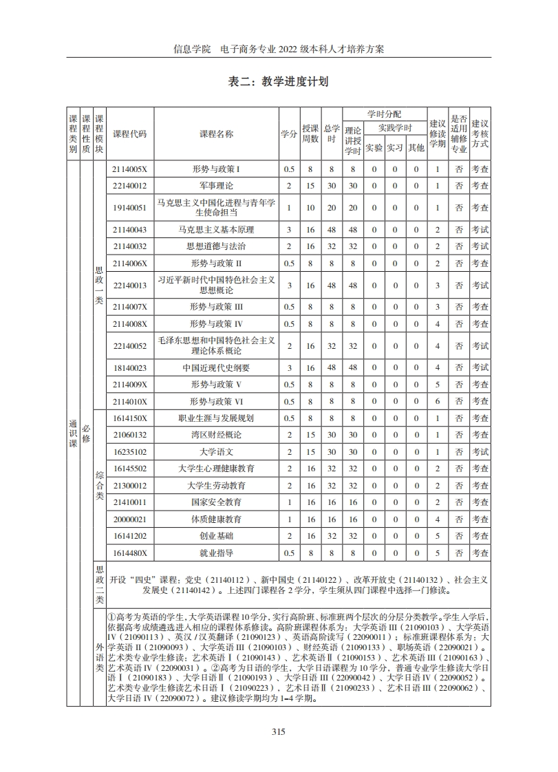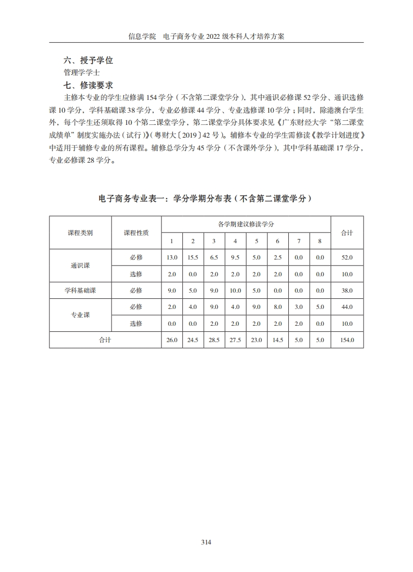 信息学院电子商务专业2022级本科人才培养方案信息学院电子商务专业2022级本科人才培养方案一、培养目标植根财经,立足粤港澳大湾区、辐射全国、面向世界,培养德、智、体、美、劳全面发展,具备扎实的管理学、经济学、法学、计算机科学与技术等电子商务相关的多学科融合交叉知识,熟练掌握电子化商务技术、数字化数据分析技术、数据化管理技术、前端设计与开发、信息化项目管理技术等基本技能与方法,适应商务运营、专业管理和技术服务对知识复合型、应用创新型电子商务类专业人才需要,具有“家国情怀、湾区精神、实践能力、创新意识、国际视野”的大湾区一流(财经)电子商务中高级专业人才。毕业后能够在各类企事业单位(特别是电子商务平台企业)、政府机关及有关部门从事(跨境)电子商务运营与管理、商务数字化数据分析、商务数据化管理、商业应用前端设计与开发工作,或进入高等学府、研究机构继续进行专业学习深造。二、培养要求1.知识要求(1)掌握现代管理和经济理论、具备扎实的专业知识和基础知识:(2)掌握电子商务专业理论、方法与技术;(3)了解电子商务新兴产业前沿动态和商业模式创新。2.能力要求(1)具备管理学、经济学、信息技术学科交叉复合能力:(2)具备较强数字化数据处理能力、数据化管理能力和互联网技术应用开发能力;(3)具备优秀的电子商务运营管理能力和解决复杂问题的能力;(4)综合运用专业知识和技术,创意、创新和创业能力。3.素质要求(1)良好的政治素质、道德素养、职业素养;(2)良好的人文素养、科学素养、信息安全与保密素养;(3)良好的国际化视野、合作精神、创新精神及创业意识。三、所属专业类电子商务类四、专业核心课程经济学概论、管理学、会计学、管理运筹学、电子商务导论、移动电子商务、电子商务组织与运营网络营销学、电子商务物流与供应链、电子商务客户关系管理、电子商务安全与管理、电子支付与结算、计算机网络、程序设计基础、Pytho编程基础、数据结构、面向对象程序设计、数据库原理、网络创业与创业管理、商务创新与UI设计、商业数据分析与决策优化。五、标准修业年限四年313