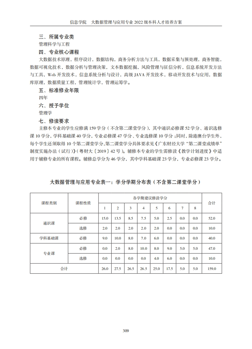 信息学院大数据管理与应用专业2022级本科人才培养方案信息学院大数据管理与应用专业2022级本科人才培养方案一、培养目标本专业依托学校财经学科优势,强化学科交叉,培养既掌握现代信息技术,又熟悉财经领域知识的本科学生。毕业生熟悉现代企业的组织与运营模式、财经领域业务流程及业务逻辑,同时又熟练掌握计算机软件与硬件、程序设计、数据库与数据分析、系统分析与集成等方面的知识和能力。毕业生能够在工商、金融、电商、信息咨询、媒体、电信、交通等企业或党政部门、学校等单位从事数据分析、数据挖掘、产品运营策划与咨询、数据可视化、大数据管理系统研发及架构设计,能综合运用上述方法和技术解决行业大数据分析问题的高级应用型人才,也可继续攻读相关学科的研究生。二、培养要求本专业具有鲜明的交叉学科特征,要求学生掌握扎实的数据科学、数学、统计学和财经等多学科基础知识和理论方法,具有系统的理性思维和较高的科学素养,掌握现代统计方法和技术、计算机算法思想和编程技术、大数据处理技术,同时具备较高的人文素养和道德品质,身心健康,全面发展。本专业毕业生应获得以下几方面的知识和能力。1.知识结构要求:(1)基础知识:具备数据科学、微积分、概率论、数理统计、线性代数、程序设计等学科基础知识,具备英语的听、说、读、写等基本知识及能按要求撰写规范文档和报告;(2)核心知识:大数据技术原理、商务分析方法与工具、数据采集与预处理、数据质量工程、商务智能、数据可视化技术、信息系统开发方法与工具、Wb开发技术、信息系统分析与设计、数据安全、liur应用开发等专业核心知识:(3)扩展知识:文本数据挖掘、自然语言处理、高级Java开发技术、移动开发技术与应用、区块链技术、大数据分析与挖掘等学科扩展知识。2.能力结构要求:(1)基础能力:能开展初步的数据采集与存储,能编写程序、建立数学模型:(2)核心职业能力:能综合运用数学和统计学理论与方法,结合计算机编程技术和现有软件平台,实现对海量数据(尤其是非结构化数据)的统计分析,并根据分析结果提供决策支持;(3)扩展能力:掌握文本数据挖掘、自然语言处理、移动开发技术与应用、区块链技术、大数据分析与挖掘,能完成商业数据分析、商务数据挖掘等更复杂的财经类数据分析工作;能应用现代的信息技术,了解本专业的前沿技术和行业的发展动态,开展初步的科学研究工作。3.素质结构要求:(1)思想道德素质:掌握马列主义、毛泽东思想与中国特色社会主义基本理论,具有良好的人文社会科学素养、职业道德和心理素质,社会责任感强,有正确的世界观、人生观、价值观,遵纪守法,为人正直诚实,具有良好的职业道德和公共道德;(2)身心素质:拥有健康的体魄,养成良好的体育锻炼和卫生习惯,具备健全的心理和乐观的人生态度:(3)人文素质:具有良好的文化基础和修养,善于自学,同时关注本行业科学技术的新发展,不断更新知识,具有社会交往、处理公共关系的基本能力:(4)职业素质:具有良好的社会实践、社会沟通、合作及协调能力,爱岗敬业、遵纪守法的品质,有立业创业的意识,有严谨务实的工作作风。308