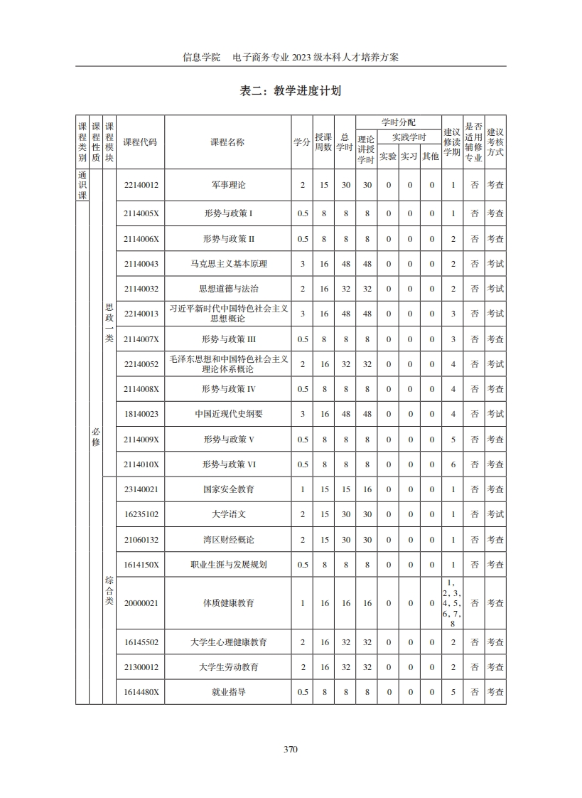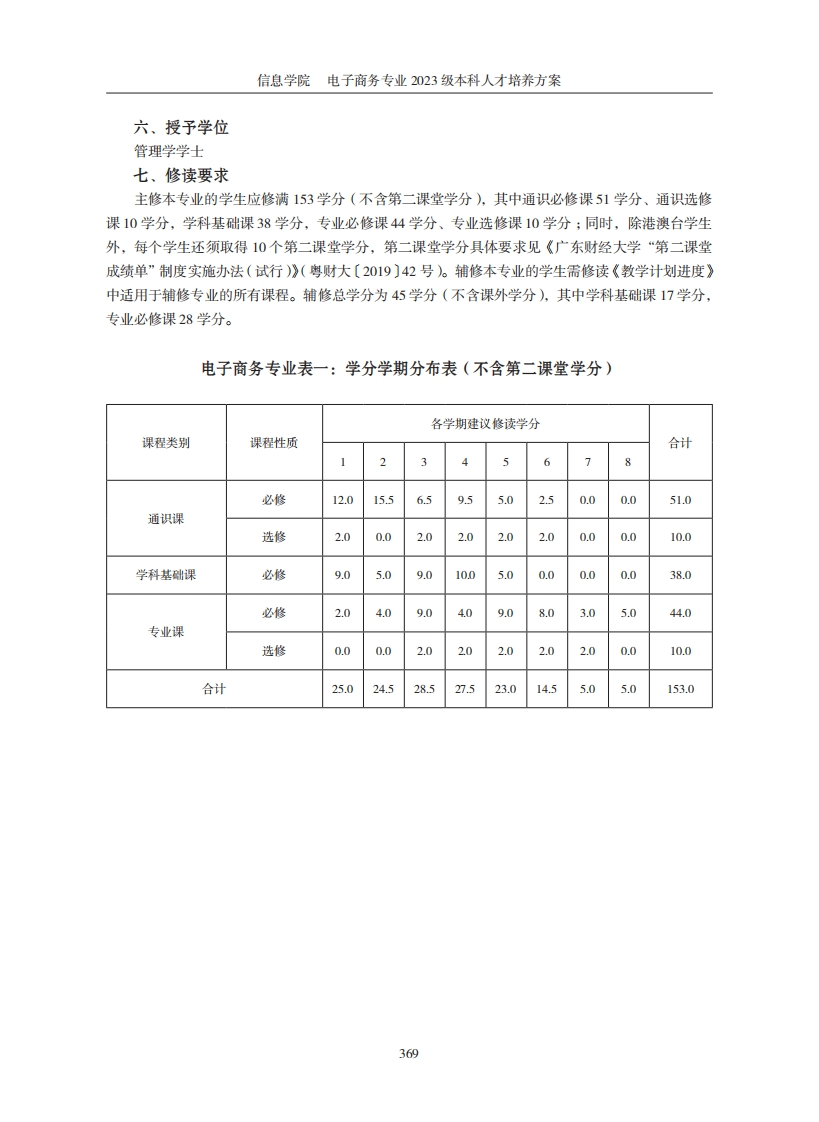 信息学院电子商务专业2023级本科人才培养方案信息学院电子商务专业2023级本科人才培养方案一、培养目标植根财经,立足粤港澳大湾区、辐射全国、面向世界,培养德、智、体、美、劳全面发展,具备扎实的管理学、经济学、法学、计算机科学与技术等电子商务相关的多学科融合交叉知识,熟练掌握电子化商务技术、数字化数据分析技术、数据化管理技术、前端设计与开发、信息化项目管理技术等基本技能与方法,适应商务运营、专业管理和技术服务对知识复合型、应用创新型电子商务类专业人才需要,具有“家国情怀、湾区精神、实践能力、创新意识、国际视野”的大湾区一流(财经)电子商务中高级专业人才。毕业后能够在各类企事业单位(特别是电子商务平台企业)、政府机关及有关部门从事(跨境)电子商务运营与管理、商务数字化数据分析、商务数据化管理、商业应用前端设计与开发工作,或进入高等学府、研究机构继续进行专业学习深造。二、培养要求1.知识要求(1)掌握现代管理和经济理论、具备扎实的专业知识和基础知识:(2)掌握电子商务专业理论、方法与技术;(3)了解电子商务新兴产业前沿动态和商业模式创新。2.能力要求(1)具备管理学、经济学、信息技术学科交叉复合能力:(2)具备较强数字化数据处理能力、数据化管理能力和互联网技术应用开发能力;(3)具备优秀的电子商务运营管理能力和解决复杂问题的能力;(4)综合运用专业知识和技术,创意、创新和创业能力。3.素质要求(1)良好的政治素质、道德素养、职业素养:(2)良好的人文素养、科学素养、信息安全与保密素养:(3)良好的国际化视野、合作精神、创新精神及创业意识。三、所属专业类电子商务类四、专业核心课程经济学概论、管理学、会计学、管理运筹学、电子商务导论、移动电子商务、电子商务组织与运营、网络营销学、电子商务物流与供应链、电子商务客户关系管理、电子商务安全与管理、电子支付与结算、计算机网络、程序设计基础、Pyho编程基础、数据结构、面向对象程序设计、数据库原理、网络创业与创业管理、商务创新与I设计、商业数据分析与决策优化。五、标准修业年限四年368