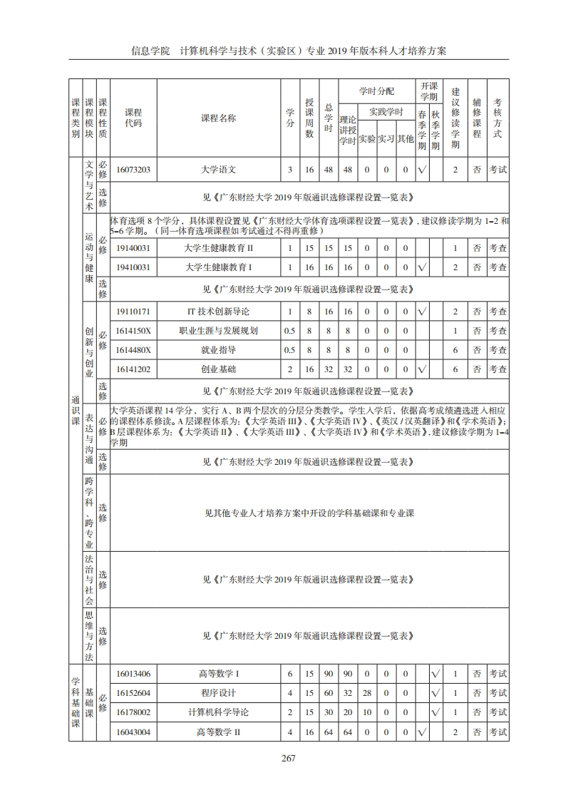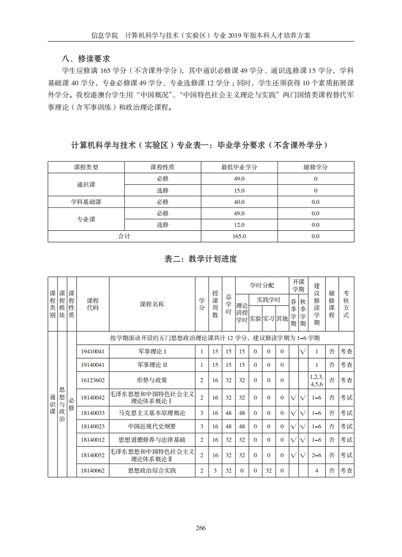 信息学院计算机科学与技术(实验区)专业2019年版本科人才培养方案信息学院计算机科学与技术(实验区)专业2019年版本科人才培养方案一、培养目标本实验班培养适应国家和区域经济发展需求,掌握计算机科学基本理论知识、技能、方法,具备计算机科学研究与技术应用能力,有创新意识和团队协作精神,在T应用领域能够从事软件系统设计、开发与应用、智能计算等工作,具备全面的信息化视野、创新意识,具有较强竞争优势和卓越工程师潜质的高级复合型、应用型T人才。二、培养要求1.知识结构要求:(1)掌握从事本专业工作所需的数学和其他相关的自然科学知识以及一定的经济学与管理学知识;(2)系统掌握计算机科学与技术学科的基础理论和专业知识,理解本学科的基本概念、知识结构和典型方法;(3)掌握计算学科的基本思维方法和研究方法,具有良好的科学素养和一定的工程意识;(4)了解计算机科学与技术学科的发展现状和趋势;(5)了解与本专业相关的职业和行业的重要法律法规及方针政策,掌握信息技术应用相关的数据分析能力。2.能力结构要求:(1)培养计算思维能力,能运用计算机科学的基础概念去求解问题、设计系统以及理解信息化处理过程;(2)培养专业实践能力,可以完成程序、软件系统、硬件系统、网络系统及各类计算机应用系统的设计与实现,能够综合运用所掌握的知识、方法和技术解决实际问题;(3)具备终身学习意识以及运用现代技术获取相关信息和新技术、新知识的能力:(4)具有创新意识,并具有技术创新的初步能力;(5)具有一定的组织管理能力、表达能力、独立工作能力、人际交往能力和团队合作能力。3.素质结构要求:(1)具有良好的思想品德和较高的道德情操,热爱社会主义祖国,拥护中国共产党的领导,掌握马列主义、毛泽东思想与中国特色社会主义基本理论:(2)身体健康;(3)具有良好的人文社会科学素养、职业道德和心理素质,社会责任感强;(4)能独立思考,坚持理论联系实际、实事求是和谦虚谨慎、认真细致的科学态度;(5)自觉自愿地遵守职业道德规范。三、主千学科计算机科学与技术四、所属专业类计算机类五、专业核心课程计算机科学导论、程序设计、数据结构、计算机组成原理与汇编语言、操作系统、计算机网络编译原理、数据库原理、算法分析与设计、软件工程、离散数学。六、标准修业年限四年七、授予学位工学学土265