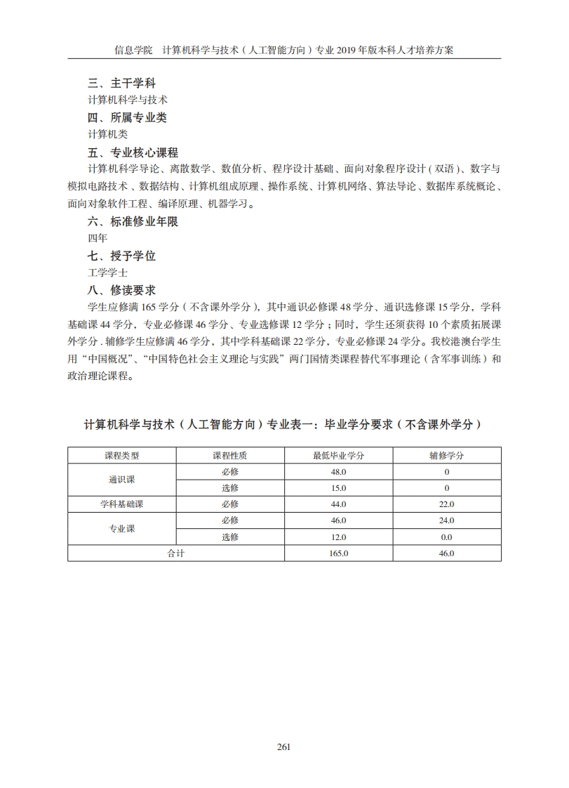 信息学院计算机科学与技术(人工智能方向)专业2019年版本科人才培养方案信息学院计算机科学与技术(人工智能方向)专业019年版本科人才培养方案一、培养目标培养适应国家战略发展需求和行业发展,系统掌握计算机科学、大数据和人工智能的基本理论和前沿技术,在经济、管理、法律等应用领域具有较强的知识获取能力、工程能力和创新创业能力的宽口径复合型、及素质、能力、知识协调统一的应用型卓越人才。能在企事业单位从事与人工智能相关的智能应用系统、智能信息处理、智能行为决策等方面的领域应用、工程设计、决策管理等工作。二、培养要求学生学习计算机科学与技术的基本理论及专业知识,接受人工智能应用的实践培养,具有在经济、管理、法律等领域从事智能应用、开发及管理的综合能力。1.知识结构要求:(1)掌握从事本专业工作所需的数学和相关自然科学基础以及一定的人文社会科学基础(经管法等)知识;(2)系统掌握计算机科学与技术学科的基础理论和专业知识,理解本学科的基本概念、知识结构和典型方法;(3)掌握人工智能应用的实践方法和工具,获得较好的实践训练;(4)了解本专业学科的前沿和发展趋势;(5)了解与本专业相关的职业和行业的重要法律法规及方针政策,理解工程技术与信息技术应用相关的伦理的基本要求。2.能力结构要求:(1)具有从事智能软件开发、智能计算应用以及AI+应用等工作的能力;(2)具有较强的创新能力和信息获取能力,能将人工智能技术与计算机技术、信息处理技术等有机结合应用于工程与管理实践;(3)具有一定的组织管理能力、表达能力、独立工作能力、人际交往能力和团队合作能力;(4)具有一定的外语应用能力,能阅读本专业的外文资料,具有一定的国际视野和跨文化交流、竞争与合作能力;(5具有较强的社会适应能力,能应对工作变动和环境变化给自身带来的影响,能有效参与竞争。3.素质结构要求:(1)具有良好的思想品德和较高的道德情操,热爱社会主义祖国,拥护中国共产党的领导,掌握马列主义、毛泽东思想与中国特色社会主义基本理论:(2)具有良好的人文社会科学素养、职业道德和心理素质,社会责任感强:(3)能独立思考,坚持理论联系实际、实事求是和谦虚谨慎、认真细致的科学态度;(4)自觉自愿地遵守职业道德规范。260
