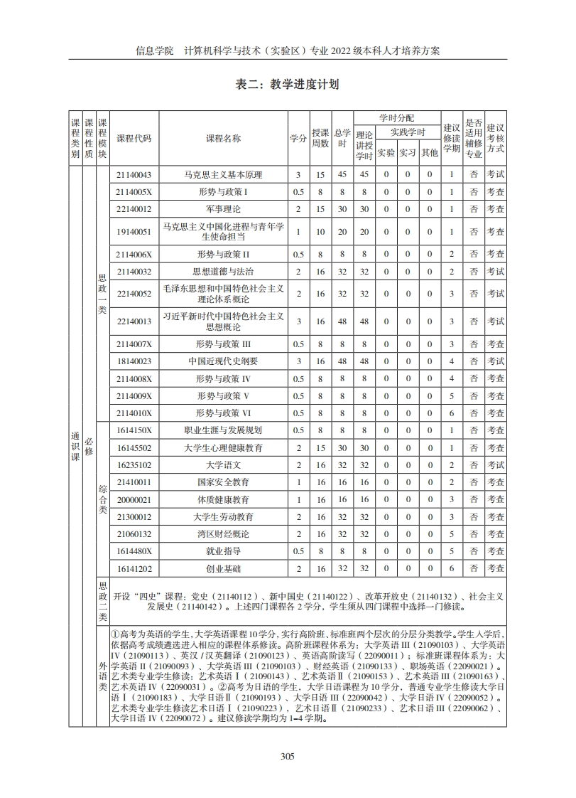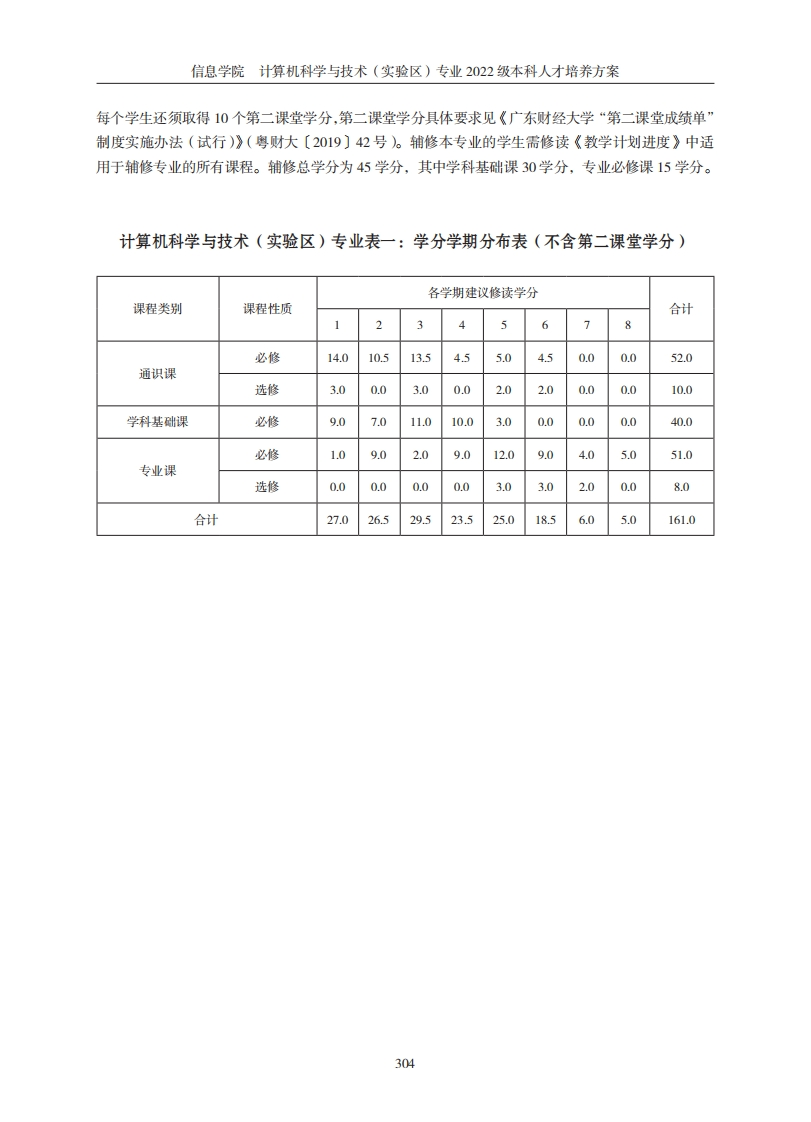 信息学院计算机科学与技术(实验区)专业2022级本科人才培养方案信息学院计算机科学与技术(实验区)专业2022级本科人才培养方案一、培养目标本实验区培养适应国家和粤港澳大湾区经济发展需求,德、智、体、美、劳全面发展,系统掌握计算机科学基本理论知识、技能、方法,具有一定的数理及经管基础,熟悉人工智能的基本理论和应用技术,具有从事金融软件开发、经济计算及商务智能应用等工作的能力,能将金融、商务及经济知识与信息处理技术有机结合应用于工程与管理实践,具有跨学科交叉能力和创新创业能力,能够胜任政府机关、企事业单位、科研院所尤其是金融机构和金融科技企业中的计算机系统分析、设计、开发及研究等相关工作的“计算机+”复合型卓越人才。二、培养要求:1.知识要求:(1)了解与本专业相关的职业和行业的重要法律法规及方针政策,理解工程技术与信息技术应用相关的伦理的基本要求;(②)掌握从事本专业工作所需的数学和其他相关的自然科学知识以及一定的人文社会科学基础(经管法等)知识;(3)系统掌握计算机科学与技术学科的基础理论和专业知识,理解本学科的基本概念、知识结构和典型方法,了解本专业学科的前沿和发展趋势。2.能力要求:(1)具有计算思维能力,能运用计算机科学技术求解问题,具备专业实践能力,可以完成软件系统开发、算法应用以及行业领域应用等实际工作;(②)具有较强的创新能力和信息获取能力,能将人工智能技术与经济知识、管理知识及金融等有机结合应用于工程与管理实践;(3)具有一定的组织管理能力、表达能力、独立工作能力、人际交往能力和团队合作能力,具有一定的外语应用能力,具有一定的国际视野和跨文化交流、竞争与合作能力3.素质要求:(1)具有良好的思想品德和较高的道德情操,热爱社会主义祖国,拥护中国共产党的领导,掌握马列主义、毛泽东思想与中国特色社会主义基本理论:(②)具有良好的人文社会科学素养、职业道德和心理素质,社会责任感强;(③)能独立思考,坚持理论联系实际、实事求是和谦虚谨慎、认真细致的科学态度,自觉自愿地遵守职业道德规范。三、所属专业类计算机类四、专业核心课程计算机科学导论、面向对象程序设计(双语)、数据结构、计算机组成原理、操作系统、管理运筹学、数据库原理、计算机网络、编译原理、算法设计与分析、人工智能基础、机器学习、软件工程。五、标准修业年限四年六、授予学位工学学士七、修读要求主修本专业的学生应修满161学分(不含第二课堂学分),其中通识必修课52学分、通识选修课10学分,学科基础课40学分,专业必修课51学分、专业选修课8学分;同时,除港澳台学生外,303