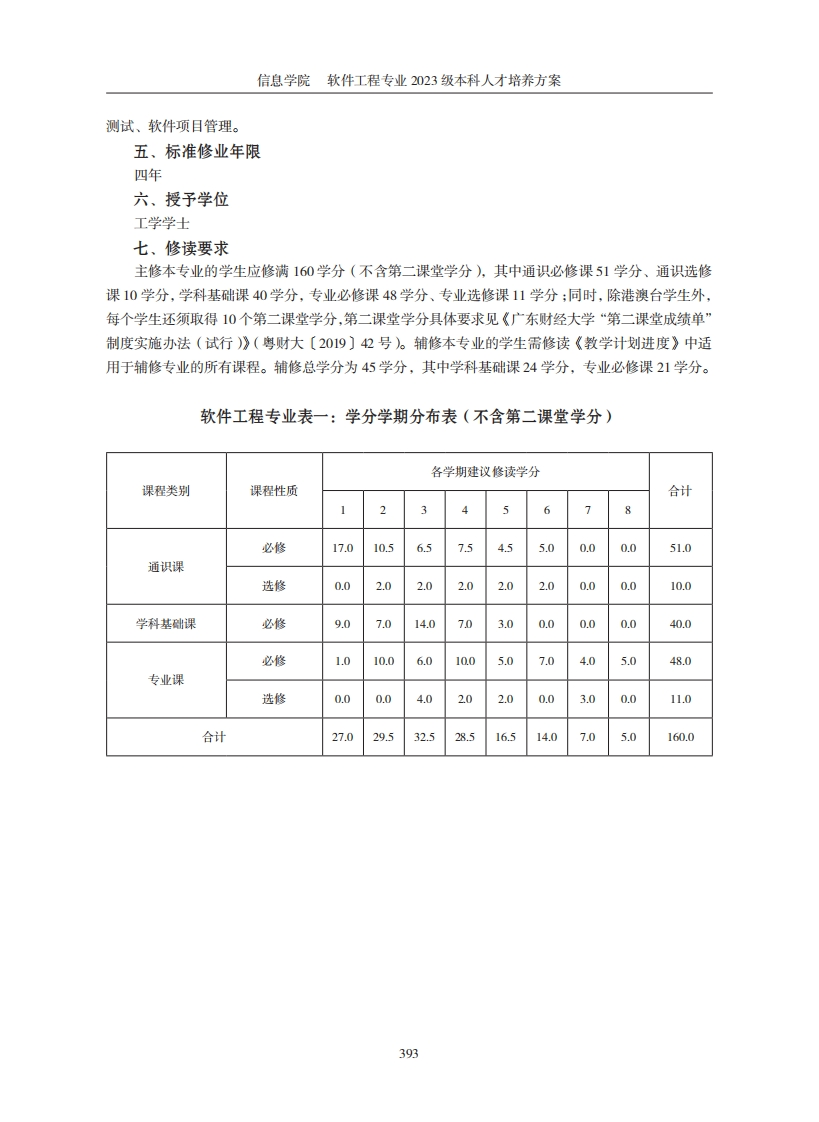 信息学院软件工程专业2023级本科人才培养方案信息学院软件工程专业2023级本科人才培养方案一、培养目标本专业面向国家和粤港澳大湾区经济发展需求,培养适应国家和粤港澳大湾区经济发展需求,德、智、体、美、劳全面发展,掌握数学与自然科学基础知识及计算机科学相关的基本理论、基本知识和基本方法,具有良好的软件技术与工程素养,熟练掌握软件工程技术、软件工程管理以及软件服务工程的基本知识与技能,能够从事软件工程技术研究、设计、开发、测试、软件项目管理与服务等工作,能将先进的软件工程思想和服务管理运营技术熟练应用于银行、证券、财务等金融领域,并能适应T行业未来发展需要的高素质T工程应用型专门人才。二、培养要求:依据中国工程教育专业认证的标准和要求,根据软件工程专业特点,同时具备较高的人文素养和道德品质,身心健康,全面发展。本专业毕业生应获得以下几方面的知识和能力。1.知识要求:(1)掌握从事本专业工作所需的数学(特别是离散数学)和其他相关的自然科学知识以及一定的经济学与管理学知识:(2)掌握软件工程的基本理论与专业知识;(3)掌握软件设计开发方法、过程和主流的开发工具:(4)熟悉软件项目管理,了解软件工程的发展动态;(5)了解与本专业相关的职业和行业的重要法律法规及方针政策,理解工程技术与信息技术应用相关的理论的基本要求。2.能力要求:(1)具有从事大型软件项目规划、分析、设计、实现、测试、维护和管理等工作的能力;(2)具有较强的创新意识和信息获取能力,能够有效地进行软件工程新技术、新方法和新工具的探索,具有创新意识,并具有技术创新的初步能力:(3)具有一定的组织管理能力、表达能力、独立工作能力、人际交往能力和团队合作能力:(4)具有一定的外语应用能力,能阅读本专业的外文资料,具有一定的国际视野和跨文化交流、竞争与合作能力:(5)具有较强的社会适应能力,能应对工作变动和环境变化给自身带来的影响,能有效参与竞争。3.素质要求:(1)具有良好的思想品德和较高的道德情操,热爱社会主义祖国,拥护中国共产党的领导,掌握马列主义、毛泽东思想与中国特色社会主义基本理论:(2)人格健全,具有良好的人文社会科学素养、职业道德和心理素质,社会责任感强,有正确的世界观、人生观、价值观,遵纪守法,为人正直诚实,具有良好的职业道德和公共道德:(3)身心素质:能独立思考,坚持理论联系实际、实事求是和谦虚谨慎、认真细致的科学态度;拥有健康的体魄,养成良好的体育锻炼和卫生习惯,具备健全的心理和乐观的人生态度;(4)职业素质:具有良好的社会实践、社会沟通、合作及协调能力,爱岗敬业、遵纪守法的品质,有立业创业的意识,有严谨务实的工作作风。三、所属专业类计算机类四、专业核心课程程序设计、离散数学、数据结构与算法、数据库原理、软件工程、操作系统、软件构件与中间件技术、计算机网络、需求分析与系统设计、软件设计模式、智能交互技术实践、软件质量保证与392