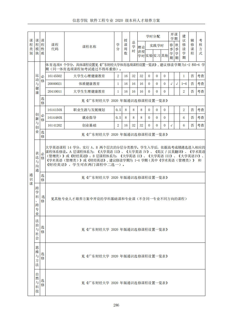 信息学院软件工程专业2020级本科人才培养方案信息学院软件工程专业2020级本科人才培养方案一、培养目标本专业培养具有良好的软件技术与工程素养,熟练掌握软件工程技术、软件工程管理以及软件服务工程的基本知识与技能,具备良好的计算机科学与技术知识基础,能够从事软件工程技术研究、设计、开发、测试、软件项目管理与服务等工作,并能适应IT行业未来发展需要的高级工程应用型专门人才。二、培养要求1.知识结构要求:(1)掌握从事本专业工作所需的数学(特别是离散数学)和其他相关的自然科学知识以及一定的经济学与管理学知识:(2)掌握软件工程的基本理论与专业知识:(3)掌握软件设计开发方法、过程和主流的开发工具:(4)熟悉软件项目管理,了解软件工程的发展动态:(5)了解与本专业相关的职业和行业的重要法律法规及方针政策,理解工程技术与信息技术应用相关的理论的基本要求。2.能力结构要求:(1)具有从事大型软件项目规划、分析、设计、实现、测试、维护和管理等工作的能力:(2)具有较强的创新能力和信息获取能力,能够有效地进行软件工程新技术、新方法和新工具的探索,具有创新意识,并具有技术创新的初步能力:(3)具有一定的组织管理能力、表达能力、独立工作能力、人际交往能力和团队合作能力:(4)具有一定的外语应用能力,能阅读本专业的外文资料,具有一定的国际视野和跨文化交流、竞争与合作能力:(5)具有较强的社会适应能力,能应对工作变动和环境变化给自身带来的影响,能有效参与竞争。3.素质结构要求:(1)具有良好的思想品德和较高的道德情操,热爱社会主义祖国,拥护中国共产党的领导,掌握马列主义、毛泽东思想与中国特色社会主义基本理论:(2)身体健康:(3)具有良好的人文社会科学素养、职业道德和心理素质,社会责任感强:(4)能独立思考,坚持理论联系实际、实事求是和谦虚谨慎、认真细致的科学态度:(5)自觉自愿地遵守职业道德规范。三、主干学科软件工程四、所属专业类计算机类五、专业核心课程程序设计、高等数学I、高等数学II、离散数学、线性代数、数据结构与算法、计算机系统基础、数据库原理、软件工程、操作系统、软件构造与构件、计算机网络、软件需求、软件设计模式、人机交互技术、软件质量保证与测试、软件项目管理六、标准修业年限四年七、授予学位工学学位284