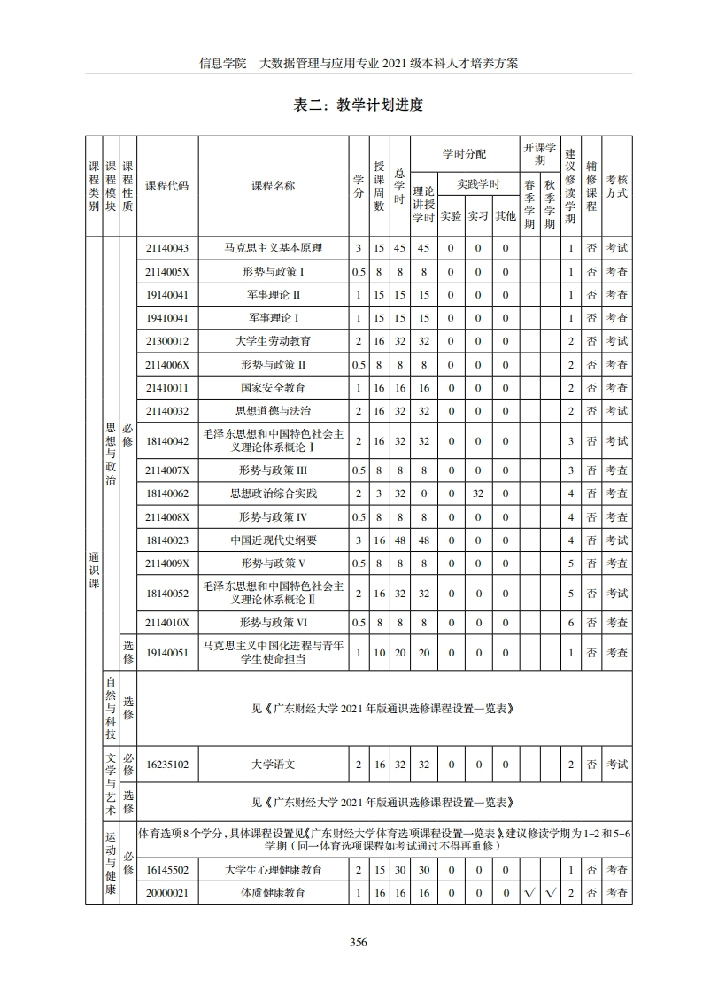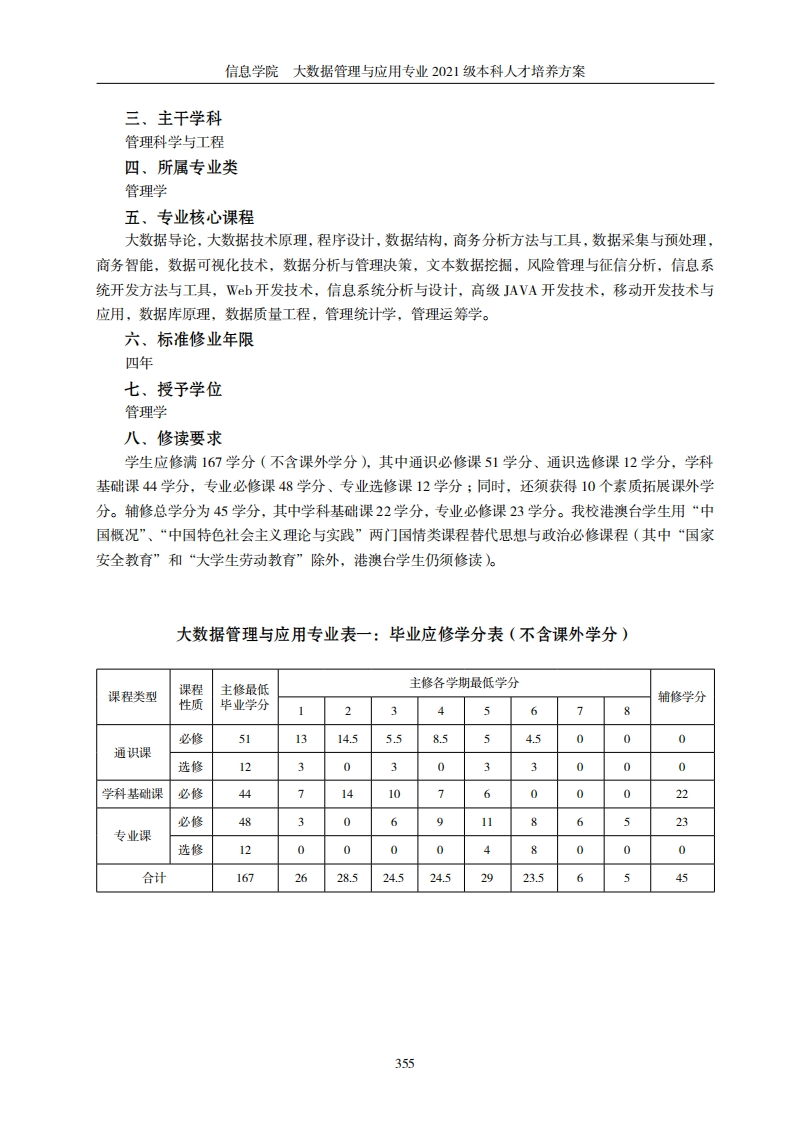 信息学院大数据管理与应用专业2021级本科人才培养方案信息学院大数据管理与应用专业2021级本科人才培养方案一、培养目标本专业依托学校财经学科优势,强化学科交叉,培养既熟悉财经领域知识,又掌握现代信息技术的本科学生。毕业生熟悉现代企业的组织与运营模式、财经领域业务流程及业务逻辑,同时又熟练掌握计算机软件与硬件、程序设计与算法、数据库与数据挖掘、系统分析与集成等方面的知识和能力。毕业生能够在工商、金融、电商、信息咨询、媒体、电信、交通等企业或党政部门、学校等单位从事数据分析、数据挖掘、产品运营策划与咨询、数据可视化、大数据管理系统研发及架构设计,能综合运用上述方法和技术解决行业大数据分析问题的高级应用型人才,也可继续攻读管理科学、人工智能等学科的研究生。二、培养要求本专业具有鲜明的交叉学科特征,要求学生掌握扎实的数据科学、数学、统计学和财经等多学科基础知识和理论方法,具有系统的理性思维和较高的科学素养,掌握现代统计方法和技术、计算机算法思想和编程技术、大数据处理技术,同时具备较高的人文素养和道德品质,身心健康,全面发展。本专业毕业生应获得以下几方面的知识和能力。1.知识结构要求:(1)基础知识:具备数据科学、高等数学、概率论、数理统计、离散数据线性代数、程序设计等学科基础知识,具备英语的听、说、读、写等基本知识及能按要求撰写规范文档和报告;(2)核心知识:大数据采集技术、数据导入与预处理、数据集成技术、数据结构与算法、数据仓库与数据挖掘、面向对象程序设计Gav)、数学建模、计算统计、数据存储技术、数据可视化技术,Pyhm程序设计,金融大数据分析应用等专业核心知识;(3)扩展知识:大数据开发技术、机器学习与模式识别、金融风险与征信分析、商务统计建模与决策、抽样调查理论与方法、虚拟化技术原理与实践、高维数据分析、文本数据挖掘、社交网络分析、深度学习等学科扩展知识。2.能力结构要求:(1)基础能力:能开展初步的数据采集与存储,能编写程序、建立数学模型:(2)核心职业能力:能综合运用数学和统计学理论与方法,结合计算机编程技术和现有软件平台,实现对海量数据(尤其是非结构化数据)的统计分析,并根据分析结果提供决策支持:(3)扩展能力:掌握高维数据分析、文本数据挖掘、深度学习、云技术等现代数据科学方法和技术,能完成金融风险与征信分析、商务数据挖掘等更复杂的财经类数据分析工作:能应用现代的信息检索技术,了解本专业的前沿技术和行业的发展动态,开展初步的科学研究工作。3.素质结构要求:(1)思想道德素质:掌握马列主义、毛泽东思想与中国特色社会主义基本理论,具有良好的人文社会科学素养、职业道德和心理素质,社会责任感强,有正确的世界观、人生观、价值观,遵纪守法,为人正直诚实,具有良好的职业道德和公共道德;(2)身心素质:拥有健康的体魄,养成良好的体育锻炼和卫生习惯,具备健全的心理和乐观的人生态度;(3)人文素质:具有良好的文化基础和修养,善于自学,同时关注本行业科学技术的新发展,不断更新知识,具有社会交往、处理公共关系的基本能力:(4)职业素质:具有良好的社会实践、社会沟通、合作及协调能力,爱岗敬业、遵纪守法的品质,有立业创业的意识,有严谨务实的工作作风。354
