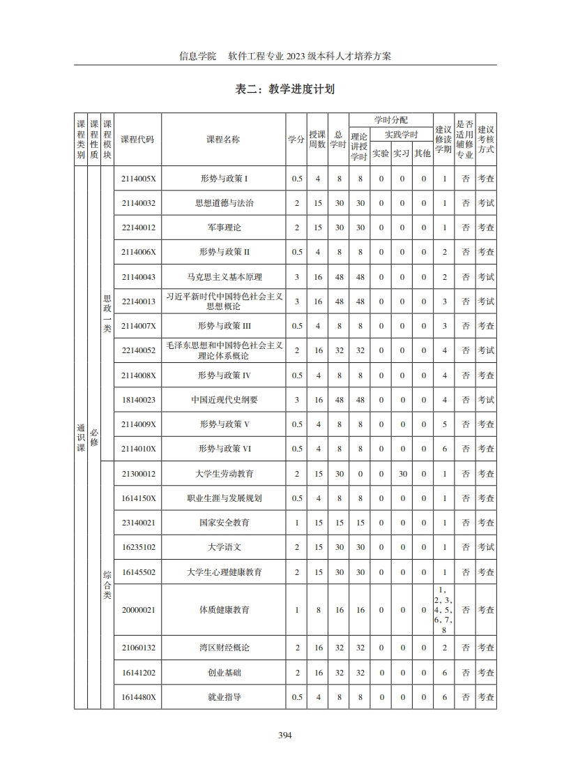 信息学院软件工程专业2023级本科人才培养方案信息学院软件工程专业2023级本科人才培养方案一、培养目标本专业面向国家和粤港澳大湾区经济发展需求,培养适应国家和粤港澳大湾区经济发展需求,德、智、体、美、劳全面发展,掌握数学与自然科学基础知识及计算机科学相关的基本理论、基本知识和基本方法,具有良好的软件技术与工程素养,熟练掌握软件工程技术、软件工程管理以及软件服务工程的基本知识与技能,能够从事软件工程技术研究、设计、开发、测试、软件项目管理与服务等工作,能将先进的软件工程思想和服务管理运营技术熟练应用于银行、证券、财务等金融领域,并能适应T行业未来发展需要的高素质T工程应用型专门人才。二、培养要求:依据中国工程教育专业认证的标准和要求,根据软件工程专业特点,同时具备较高的人文素养和道德品质,身心健康,全面发展。本专业毕业生应获得以下几方面的知识和能力。1.知识要求:(1)掌握从事本专业工作所需的数学(特别是离散数学)和其他相关的自然科学知识以及一定的经济学与管理学知识:(2)掌握软件工程的基本理论与专业知识;(3)掌握软件设计开发方法、过程和主流的开发工具:(4)熟悉软件项目管理,了解软件工程的发展动态;(5)了解与本专业相关的职业和行业的重要法律法规及方针政策,理解工程技术与信息技术应用相关的理论的基本要求。2.能力要求:(1)具有从事大型软件项目规划、分析、设计、实现、测试、维护和管理等工作的能力;(2)具有较强的创新意识和信息获取能力,能够有效地进行软件工程新技术、新方法和新工具的探索,具有创新意识,并具有技术创新的初步能力:(3)具有一定的组织管理能力、表达能力、独立工作能力、人际交往能力和团队合作能力:(4)具有一定的外语应用能力,能阅读本专业的外文资料,具有一定的国际视野和跨文化交流、竞争与合作能力:(5)具有较强的社会适应能力,能应对工作变动和环境变化给自身带来的影响,能有效参与竞争。3.素质要求:(1)具有良好的思想品德和较高的道德情操,热爱社会主义祖国,拥护中国共产党的领导,掌握马列主义、毛泽东思想与中国特色社会主义基本理论:(2)人格健全,具有良好的人文社会科学素养、职业道德和心理素质,社会责任感强,有正确的世界观、人生观、价值观,遵纪守法,为人正直诚实,具有良好的职业道德和公共道德:(3)身心素质:能独立思考,坚持理论联系实际、实事求是和谦虚谨慎、认真细致的科学态度;拥有健康的体魄,养成良好的体育锻炼和卫生习惯,具备健全的心理和乐观的人生态度;(4)职业素质:具有良好的社会实践、社会沟通、合作及协调能力,爱岗敬业、遵纪守法的品质,有立业创业的意识,有严谨务实的工作作风。三、所属专业类计算机类四、专业核心课程程序设计、离散数学、数据结构与算法、数据库原理、软件工程、操作系统、软件构件与中间件技术、计算机网络、需求分析与系统设计、软件设计模式、智能交互技术实践、软件质量保证与392