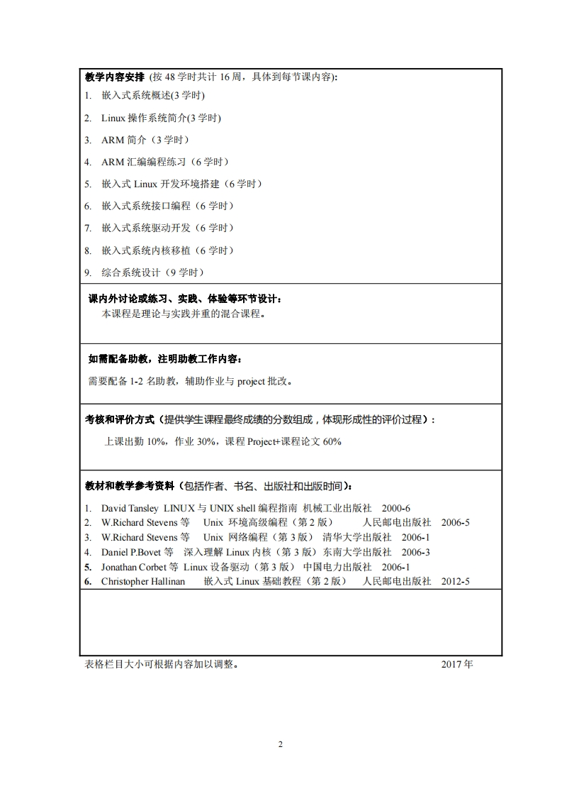复旦大学课程教学大纲院系:信息科学与工程学院日期:2017年5月16日课程代码NF0130076课程名称嵌入式系统英文名称Embedded System学分数2周学时授课语言中文课程性质口通识教育专项口核心课程口通识教育选修口大类基础口专业必修■专业选修口其他通过本课程的教学,帮助学生了解和熟悉嵌入式系统的基本构建和开发过程,了解嵌入式操作系统和应用开发的基本知识,并完成一个综合性的嵌入式系统设计。教学目的以开源硬件为平台,以嵌入式Liuⅸ为主要开发环境,讲授嵌入式系统的组成原理基本内容和开发过程,并设计模块化实验让学生动手实践,并最后指导学生开展自主设计。简介基本要求:通过这门课的学习,让学生了解嵌入式系统的基本原理和开发过程,掌握嵌入式操作系统的开发方式,并能实现简单的系统搭建和程序开发。授课方式课堂讲授与实验为主,部分内容提供资料由学生自学,提供开放实验室供学生课余进行实验。主讲数师简介:冯辉,副教授,研究方向为分布式信号处理理论及应用。承担本科生课程有:《微机与接口实验》,《线性代数》、《嵌入式系统》,承担研究生课程有:《统计学习理论及应用》,教学效果良好。散学团队成员姓名性别职称院系在教学中承担的职责