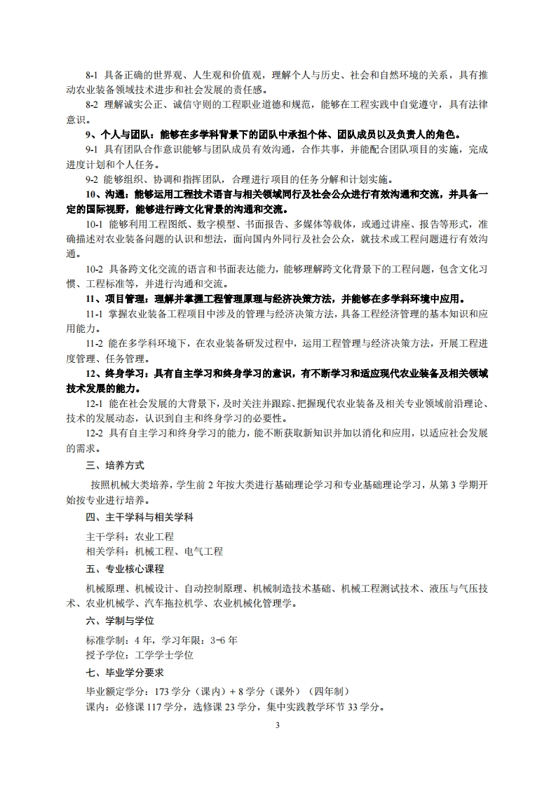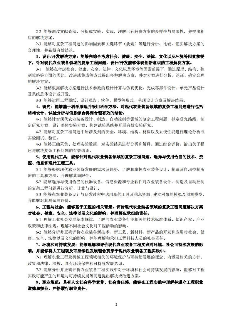 农业机械化及其自动化专业培养方案专业代码:082302专业名称:农业机械化及其自动化一、培养目标本专业培养身心健康、知识结构合理,有健全的人格、高尚的人文情怀和社会责任感,有一定的批判思维与创新能力、科学研究能力、交流沟通能力、终身学习能力和组织管理能力,具有国际视野和团队合作精神,掌握扎实的农业工程和机械工程基础理论和系统的专门知识,具备从事智能农业装备、机械工程等相关领域的科学研究、产品设计、技术研发、生产组织和管理等方面的工作能力,能在企事业和科研机构发挥骨干作用并具有领军素养的高素质复合应用型人才。学生毕业5年后,预期达到以下目标:1.知识能力:具有宽厚的数学、自然科学和工程基础知识,能综合应用基础知识、专业知识以及现代设计工具,解决农业装备和机械工程领域相关技术和产品的研究、设计、开发、测试和管理等复杂工程问题:2.职业规范:树立工程师科学道德规范与伦理责任,能够有效地将安全、行业规范、技术标准、法律法规、环境、文化等非技术因素,进行综合考量来解决复杂工程问题,在工程项目实践中能坚持公众利益优先原则:3.团队精神:能够与他人进行有效交流沟通,与他人展开合作,具备在团队中行使职责的能力:能够在跨领域、跨文化环境中工作,并能够发挥有效作用:4.国际视野:具有国际视野和跨文化的交流与合作能力,熟悉行业的国内外发展现状,了解行业发展趋势:5.终身学习:具有自主学习和自我完蕃的能力,能够跟踪专业领域前沿理论、技术,获取新知识并加以消化吸收,以适应社会发展需求。二、毕业要求1、工程知识:系统地掌握数学、自然科学、农业工程和机械工程领域的基础理论和专业知识,能综合应用上述知识解决现代农业装备设计、制造和控制等领域中的复杂工程问愿。11系统地掌握相关的数学知识,并能将其应用于分析现代农业装备领域的复杂问题,并能用数学语言表述。1-2掌握相关的物理、化学等自然科学基础,并能将其应用于分析现代农业装备领域的复杂问题,并能恰当表述。13掌握现代农业装备设计、制造、自动控制等相关工程基础知识,并能够应用其基本概念、基本理论和基本方法对研究对象进行建模、求解与分析。14掌握现代农业装备领域的专业知识,能将其与数理基础和工程基础等知识相结合,综合应用于解决现代农业装备设计、制造、控制等复杂工程问题。2、问愿分析:能够对现代农业装备设计、制造、自动控制等领域中的复杂工程问题进行识别和表达,并通过文献研究和科学分析,以获得有效结论。2-1能够应用数学、自然科学和工程科学的基本原理和方法,对现代农业装备设计、制造、自动控制等领域的复杂工程问题进行识别和分析。