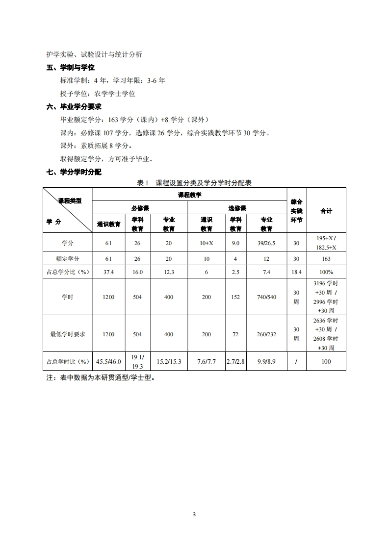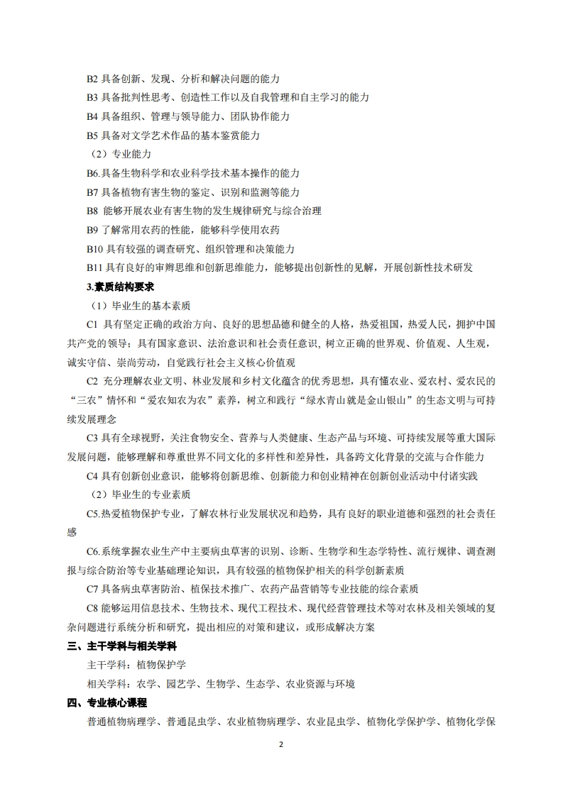 植物保护专业培养方案专业代码:091302专业名称:植物保护一、培养目标1.基本培养目标培养的学生身心健康、知识结构合理,有健全的人格、高尚的人文精神、深厚的三农情怀和社会责任感,具备批判思维与创新能力、科学研究能力、终身学习能力和组织管理能力,具有国际视野和团队合作精神,德智体美劳全面发展。2.专业培养目标以国家和社会人才需求为导向,立足旱区、面向全国,接轨“一带一路国家”,培养具有扎实植物保护专业知识和实践技能、掌握现代农业科学技术、具备国际视野与创新能力、能够在农业、园林、食品及其相关部门或单位从事植物保护教学、科学研究、开发推广、行政管理、经营等方面工作的植物保护拔尖创新人才。二、毕业要求1.知识结构要求(1)毕业生应掌握的基本知识A1掌握一定的政治、历史、哲学、文学、艺术等领域的基本知识,继承和发扬中华民族优秀传统文化A2学握社会科学的基本知识,了解基本研究方法,具有深厚的人文底蕴和求真务实的科学精神A3掌握数理与逻辑分析、物理学、化学、生物学等自然科学领域的理论知识A4掌握现代网络技术、信息处理技术等的基本知识A5掌握生态环境与人类命运、科技创新与社会发展、农业发展与政策法规、传统文化与世界文明等方面的基本知识(2)毕业生生应掌握的专业知识A6.熟悉植物学、动物学、微生物学、遗传学、生态学等学科的基本理论和基本知识A7.掌握植物保护的基本理论、基本知识、基本技能及相关学科的基础知识A8.掌握植物有害生物的发生发展规律、灾变预测及防治的基本知识A9.熟悉国际和国内植物保护学科相关的法规和行业标准A10了解农业生产及植物保护学科的科学前沿和发展趋势A11掌握科技文献检索、资料查询的基本方法:掌握一门外语,能阅读本专业文献及对外交流2.能力结构要求(1)基本能力B1具备清晰思考和用语言文字准确表达的能力y