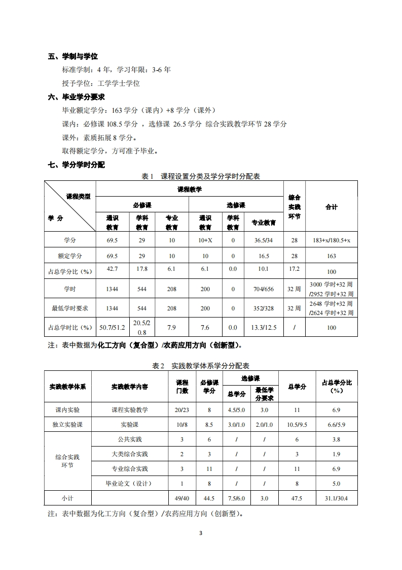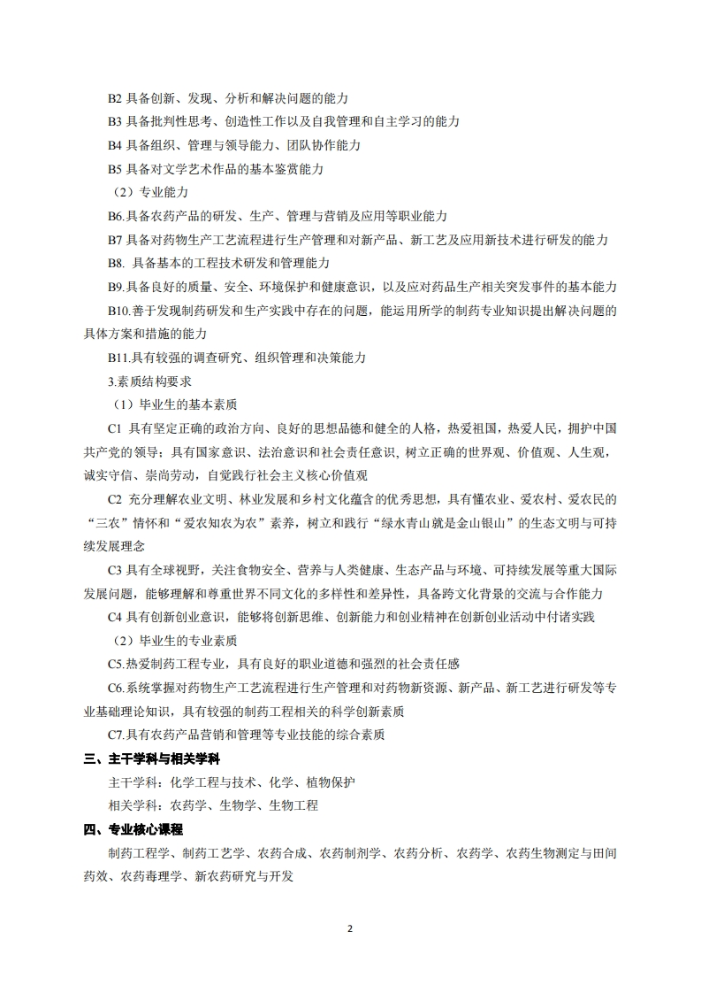 制药工程专业培养方案专业代码:081302专业名称:制药工程一、培养目标1.基本培养目标培养的学生身心健康、知识结构合理,有健全的人格、高尚的人文精神、深厚的三农情怀和社会责任感,具备批判思维与创新能力、科学研究能力、终身学习能力和组织管理能力,具有国际视野和团队合作精神,德智体美劳全面发展。2.专业培养目标以国家和社会需求为导向,培养具有扎实的制药工程(农药)专业基本知识和实践技能以及相关的现代科学技术基础理论,掌握现代农药化学、化工技术,了解制药工程学科前沿,具有创新精神、创业意识和较强的实际工作能力,在农药、化工、农业等领域能够胜任研究、开发、生产、管理、营销、推广应用等工作的复合及创新型人才。二、毕业要求1知识结构要求(1)毕业生应掌握的基本知识A1掌握一定的政治、历史、哲学、文学、艺术等领域的基本知识,继承和发扬中华民族优秀传统文化A2掌握社会科学的基本知识,了解基本研究方法,具有深厚的人文底蕴和求真务实的科学精神A3掌握数理与逻辑分析、物理学、化学、生物学等自然科学领域的理论知识A4掌握现代网络技术、信息处理技术等的基本知识A5掌握生态环境与人类命运、科技创新与社会发展、农业发展与政策法规、传统文化与世界文明等方面的基本知识(2)毕业生应掌握的专业知识A6.具有扎实的数学、物理、化学、制药工程学等基本理论知识A7.掌握药物化学、化学制药、生物制药、制药工艺等方面的基本知识A8.具备对农药生产工艺流程进行生产管理和对农药新资源、新产品、新工艺进行研发的基本知识和技能A9.熟悉国际和国内农药销售、管理及应用的有关方针、政策和法规A10.掌握科技文献检索、资料查询的基本方法2.能力结构要求(1)基本能力B1具备清晰思考和用语言文字准确表达的能力