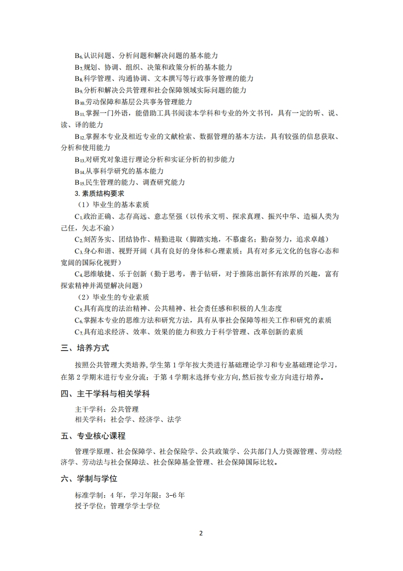 劳动与社会保障专业培养方案专业代码:120403专业名称:劳动与社会保障一、培养目标1.基本培养目标培养的学生身心健康、知识结构合理,有健全的人格、高尚的人文情怀和社会责任感,有较好的批判思维与创新能力、沟通交流能力、终身学习能力和组织管理能力,具有国际视野、中国情怀和团队合作精神,德智体美劳全面发展。2.专业培养目标培养扎实掌握社会保障领域的基本理论和知识,掌握社会保障领域的方法和政策,具有民生发展管理技能和公共事务治理能力,能够从事社会保险事务、社会福利事务管理、养老服务管理的创新型和复合型高级专门人才。二、毕业要求1.知识结构要求(1)毕业生应掌握的基本知识A1历史、哲学、文学、艺术、体育等领域的基本知识,培养学生具有马克思主义的历史观、世界观、人生观、价值观、审美观A2社会科学学科研究方法的基本知识,让学生掌握社会科学的基本知识,了解基本研究方法,具有人文情怀和社会责任感A3数理与逻辑分析的基础知识,让学生掌握基础逻辑分析、批判思维与解决问题的能力A4现代信总技术的基本知识,让学生掌握现代网络技术、通信技术和信息处理技术等的基本知识A5生态环境、生命科学、公共治理等方面的基本知识,让学生掌握科技发展与文明传承等方面的基本知识(2)本科生应掌握的专业知识A6.管理学、经济学、社会学和法学等学科的基本知识A7.公共管理学科的基本知识Ag社会保障相关领域的专业知识Ag.社会调查研究的基本知识A10.数理和社会统计及其应用软件的基本知识A11管理信息系统、现代办公设备和软件的基本知识A12就业创业的基本知识A13.从事社会保障科学研究的基本知识2.能力结构要求(1)基本能力B1清晰思考和用语言文字准确表达的能力B2发现、分析和解决问题的能力B批判性思考、创造性工作以及终身学习的能力B:组织、管理与领导能力,与人合作共事的能力B5.良好的人文素养、健康素养和科学素养(2)专业能力