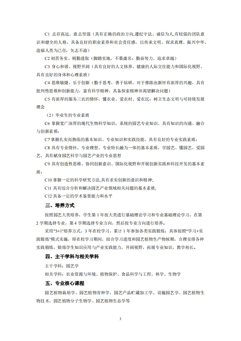园艺专业培养方案专业代码:090102专业名称:园艺一、培养目标1.基本培养目标培养德才兼备、身心健康、知识结构合理,有健全的人格、高尚的人文情怀和社会责任感,有一定的批判思维与创新能力、科学研究能力、沟通交流能力、终身学习能力和组织管理能力、具有服务国家和区域发展的志向、具备国际视野和团队合作精神、以及德智体美劳全面发展的学生。2.专业培养目标本专业培养具备坚实的生物学基础、掌握园艺学的基本理论、基本知识和专业技能,能在相关领域和部门从事园艺教学与科研、生产与推广、经营与管理及科学研究的学术精英创新型人才和创新创业技术领军和社会发展管理复合型人才。二、毕业要求1.知识结构要求(1)毕业生应掌握的基本知识A1掌握历史、哲学、文学、艺术等领域的基本知识,具备正确的历史观、世界观、人生观、价值观、审美观:A2了解社会科学的基本知识,熟悉社会科学的基本研究方法,具有人文情怀和社会责任感:A3掌握数理与逻辑分析以及数学、化学、物理、经济学、管理学的基础知识:A4掌握现代信息技术的基本知识,具备应用现代网络技术、通信技术和信息处理技术等的基本知识:A5熟悉生命科学的基本知识,掌握植物学、植物生理学、生态环境学、生物化学和遗传学等方面的基本知识与研究技能:A6熟悉生态环境与人类命运、科技创新与社会发展、农业发展与政策法规、传统文化与世界文明等方面的基本知识。(2)本科生应掌握的专业知识A7掌握园艺学科的基本理论与知识,了解园艺学科发展前沿、发展趋势、研究领域、应用前景以及产业发展状况,具有可持续发展的意识:A8掌握园艺科学研究的基本原理、方法及技能:
