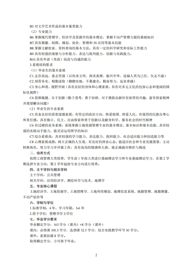 土地资源管理专业培养方案专业代码:120404专业名称:土地资源管理一、培养目标1.基本培养目标培养的学生身心健康、知识结构合理,有健全的人格、高尚的人文情怀和社会责任感,有一定的批判思维与创新能力、科学研究能力、沟通交流能力、终身学习能力和组织管理能力,具有国际视野和团队合作精神。2.专业培养目标本专业面向国家经济和社会发展需求,培养具有扎实现代管理学、经济学及资源学基本理论基础,掌握土地调查与国土空间规划、地籍测量与管理、土地制度与政策分析、不动产估价与管理、地理信息分析等研究方法和实践操作技能,熟悉国土资源及不动产管理的相关政策法规,能在自然资源管理、国土规划与整治、房地产经营与开发等领域及其他政府管理部门和企业从事资源管理、规划、房地产、金融、农业等方面工作的拔尖创新型人才和复合应用型人才。二、毕业要求1.知识结构要求(1)毕业生应掌握的基本知识A1.历史、哲学、文学、艺术等领域的基本知识(培养学生具有正确的历史观、世界观、人生观、价值观、审美观)A2.社会科学学科研究方法的基本知识(让学生掌握社会科学的基本知识,了解基本研究方法,具有人文情怀和社会责任感)A3.数理与逻辑分析的基础知识(让学生掌握数理与逻辑分析的基本知识)A4.现代信息技术的基本知识(让学生掌握现代网络技术、通信技术和信息处理技术等的基本知识)A5经济管理、生态环境、生命科学等方面的基本知识(让学生掌握生态环境与人类命运、科技创新与社会发展、农业发展与政策法规、传统文化与世界文明等方面的基本知识)(2)本科生应掌握的专业知识A6.具有宽厚的人文社会科学和自然科学的基本知识A7,掌握现代管理学、经济学及资源学的基本理论,掌握不动产管理方面的基础知识A8.掌握土地调查与规划、地籍测量与管理、土地制度与政策分析、不动产估价等专业知识A9.熟悉国家(或国际)有关土地管理、不动产领域最新发展方针、政策、法规与发展动态A10.了解土地科学、经济学、管理学的科学前沿和发展趋势,以及相关技术应用前景2.能力结构要求(1)基本能力B1.清晰思考和用语言文字准确表达的能力B2.发现、分析和解决问题的能力B3批判性思考、创造性工作以及终身学习的能力B4组织、管理与领导能力,与人合作共事的能力1