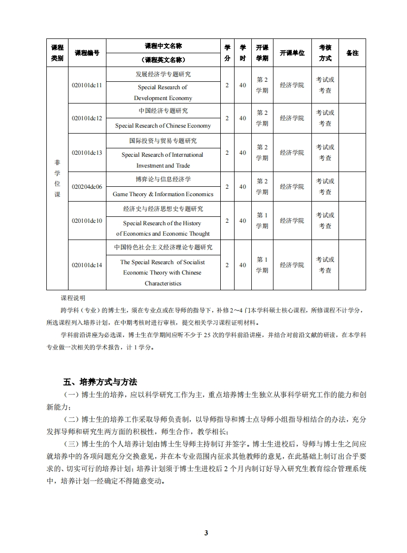 理论经济学博士研究生培养方案(代码:0201)一、学科方向1.020101政治经济学Political Economics2.020104西方经济学Western Economics3.020105世界经济World Economy4.020IO6人口、资源与环境经济学Population,Resources and Environmental Economics二、学科简介及培养目标(一)本学科的博士生应具有系统扎实的理论经济学基本知识和基础理论:能熟练运用现代经济学的理论和方法,独创性研究经济理论及实际经济问题:至少熟练掌握1门外国语,能熟练阅读本学科的外文文献,具有较强的写作能力和独立从事国际学术交流的能力:具有较强的学术素养、科学精神,诚信可靠,并且具有强烈的科学责任感:本学科博士毕业生具有独立从事研究和教学工作的能力,适合在高等院校、科研机构、经济决策和经济管理部门、金融机构、大型企业等从事高层次的教学、研究和实际经济管理工作。(二)在港、澳、台地区招收的博士生,应热爱祖国和中华文化,遵纪守法,品行端正,自觉拥护祖国统一、拥护“一国两制”、为港澳长期繁荣稳定和实现祖国和平统一做贡献的坚定爱国者,愿意为祖国和居住地的社会发展作出贡献:在海外招收的华人和其他外国籍博士生,应热爱中华文化,对中国友好,主动担当中外交流的文化使者,遵纪守法,品行端正,愿为社会发展作出贡献。(三)身心健康。三、学制和学习年限博士生的学制为3年,非全日制学习年限不少于4年。博士生的学习年限,根据情况可适当延长,最长不得超过7年。四、课程设置及学分要求本学科要求修满20学分。其中,公共学位课4学分,专业学位课6学分,非学位课10学分。课程课程中文名称学学开课考核课程编号开课单位备注类别(课程英文名称)分时学期方式第一外语(英语)公第1105590da11240外国语学院考试共First Foreign Language(English)学期港澳台学侨学生位中国现代化理论与实践研究第1马克思主义课105590da14236考试Chinese Modernization Theory学期学院and Practice Research