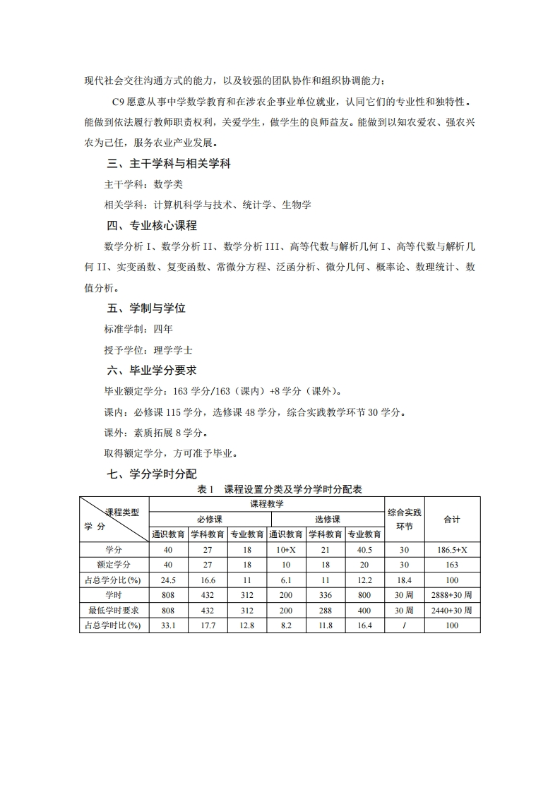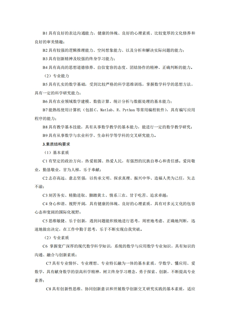 数学与应用数学专业培养方案专业代码:070101专业名称:数学与应用数学一、培养目标1.基本培养目标将学生培养成德、智、体、美、劳全面发展,具备坚实的数学理论基础,并在农业、生物、经济等学科领域受到良好的教育,具备从事数学理论科学研究与教学、农业数据挖掘与统计分析等方面的基本能力,具有国际视野,并且富有社会责任感和团队合作精神的人才。2.专业培养目标本专业培养掌握数学科学的基本理论与基本方法,具备运用数学知识、使用数学软件解决实际问题的能力,以及受到科学研究训练的高级专门人才。能在科技、教育、农业和生命等领域从事数学及交叉应用研究、教学工作或在生产经营及管理部门从事实际应用、开发研究和管理工作二、毕业要求1.知识结构要求(1)基本知识A1掌握马克思主义基本原理、毛泽东思想和习近平新时代中国特色社会主义思想理论体系的基本内容:A2了解古今中外人文、社会和科技领域的基本知识和成果,掌握自然环境与生态文明、法律与政治制度、国际关系与世界发展及祖国国情的基本知识。(2)专业知识A3掌握数学科学的基本理论知识,了解数学学科发展前沿、发展趋势、研究领域、应用前景:A4掌握数学科学研究的基本原理、方法及技能:A5掌握计算机、数学软件及农业数据挖掘方面的基本知识:A6掌握资料查询、文献检索及运用现代信息技术获得智慧农业、智慧牧业、生命健康等领域最新成果的基本方法:A7草握农业信息技术、农业试验设计、群体与数量遗传学、生物信息学与数量经济学的基本概念、理论和常用的试验方法,了解数学与农业、生命等学科交叉研究前沿及发展趋势。2.能力结构要求(1)基本能力