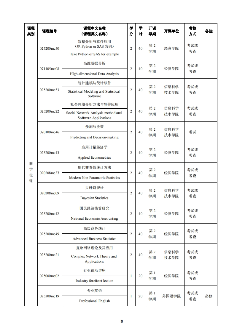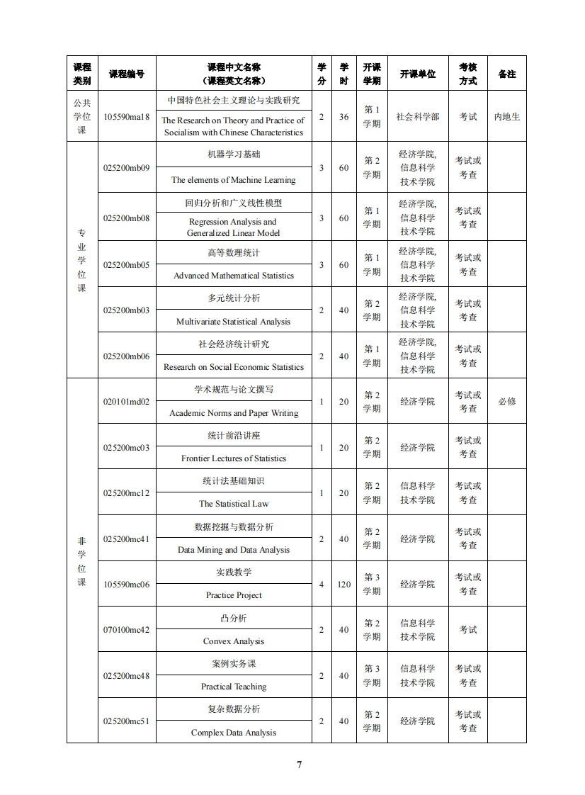 应用统计硕士专业学位研究生培养方案(代码:025200)一、培养目标应用统计硕士专业学位的培养目标是为具有国民教育序列大学本科学历(或本科同等学力)人员提供关于数据采集、整理、描述以及依据数据做出推断分析和预测等系统性的专业训练,培养具有坚实的应用统计学基础,具有数据采集、处理和分析专长,能在政府部门、企事业单位、咨询和研究机构从事应用统计工作的高级专门人才。基本要求如下:1.培养热爱祖国,遵纪守法,品行端正,求实进取,具有良好的政治素质和职业道德,积极为祖国的现代化建设服务的应用统计专门人才。2,培养具有扎实的统计专业基础,受到良好统计专业训练和逻辑思维训练,能熟练运用统计分析软件,具有独立从事实际领域数据采集、处理和分析能力的应用型统计人才。3.掌握一门外语的实际应用。4.努力锻炼身体,具有健康的体魄。二、学制及学习年限学习方式包括全日制和非全日制。全日制硕士学制2年,非全日制学制3年,学习年限最长不得超过5年。三、课程设置及学分要求最低总学分是38学分,最高总学分是38学分。其中,公共学位课4学分,专业学位课13学分,非学位课最低21学分,最高21学分。课程学类别课程编号课程中文名称学开课考核(课程英文名称)分时学期开课单位方式备注英语(跨文化交流)第1考试或105590ma26240English (Cross-学期外国语学院考查Cultural Communication)英语(学术论文写作)第1考试或公105590ma27240English (Academic Writing)学期外国语学院考查共英语学模块位英语(视听说)第1考试或四选一课105590ma28English(Viewing,Listening240学期外国语学院考查and Speaking)英语(读写译)40第1考试或105590ma292English(Reading,Writing and学期外国语学院考查Translation)6