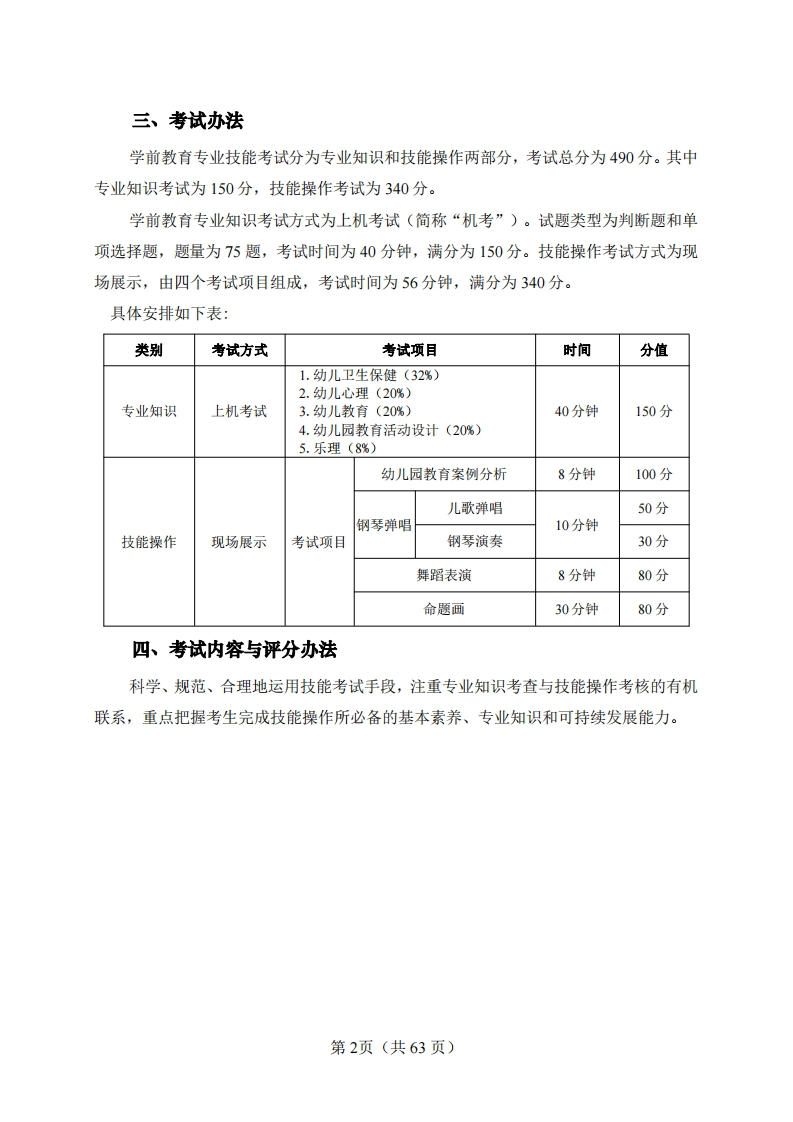2024年湖北省普通高等学校招收中等职业学校毕业生技能高考学前教育专业技能考试大纲(湖北省技能高考学前教育专业委员会制定)一、考试性质2024年湖北省普通高等学校招收中等职业学校毕业生技能高考,是面向中等职业学校(包括中等专业学校、职业高中、技工学校和成人中专)相同或相近专业毕业生的选拔性考试,学前教育专业技能考试(含专业知识、技能操作)面向中职幼儿保育等相关专业,选拔具有一定幼儿保教知识、具备学前教育专业基本素养和基础技能的毕业生,考试应当具有一定的信度、效度和区分度。二、考试依据(一)参照中华人民共和国教育部《幼儿园教育指导纲要(试行)》(教基(2001)20号),2001年9月实施:《3-6岁儿童学习与发展指南》(教基二(2012)4号),2012年10月9日发布:《幼儿园工作规程》(中华人民共和国教育部令第39号),2016年3月1日实施:《新时代幼儿园教师职业行为十项准则》(教师(2018)16号),2018年11月8日发布:《幼儿园保育教育质量评估指南》(教基〔2022)1号),2022年2月10日发布。(二)执行中华人民共和国教育部《幼儿园教师专业标准(试行)》(教师〔2012)1号),2012年2月10日印发:《中小学和幼儿园教师资格考试大纲(试行)》(面试部分),教育部师范教育司、考试中心2012年发布。1.专业理念与师德:职业理解与认知,对幼儿的态度与行为,幼儿保育和教育的态度与行为,个人修养与行为:2.专业知识:幼儿发展知识,幼儿保育和教育知识,通识知识:3.专业能力:环境的创设与利用,一日生活的组织与保育,游戏活动的支持与引导,教育活动计划的制定等。第1页(共63页)
