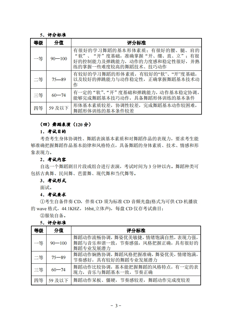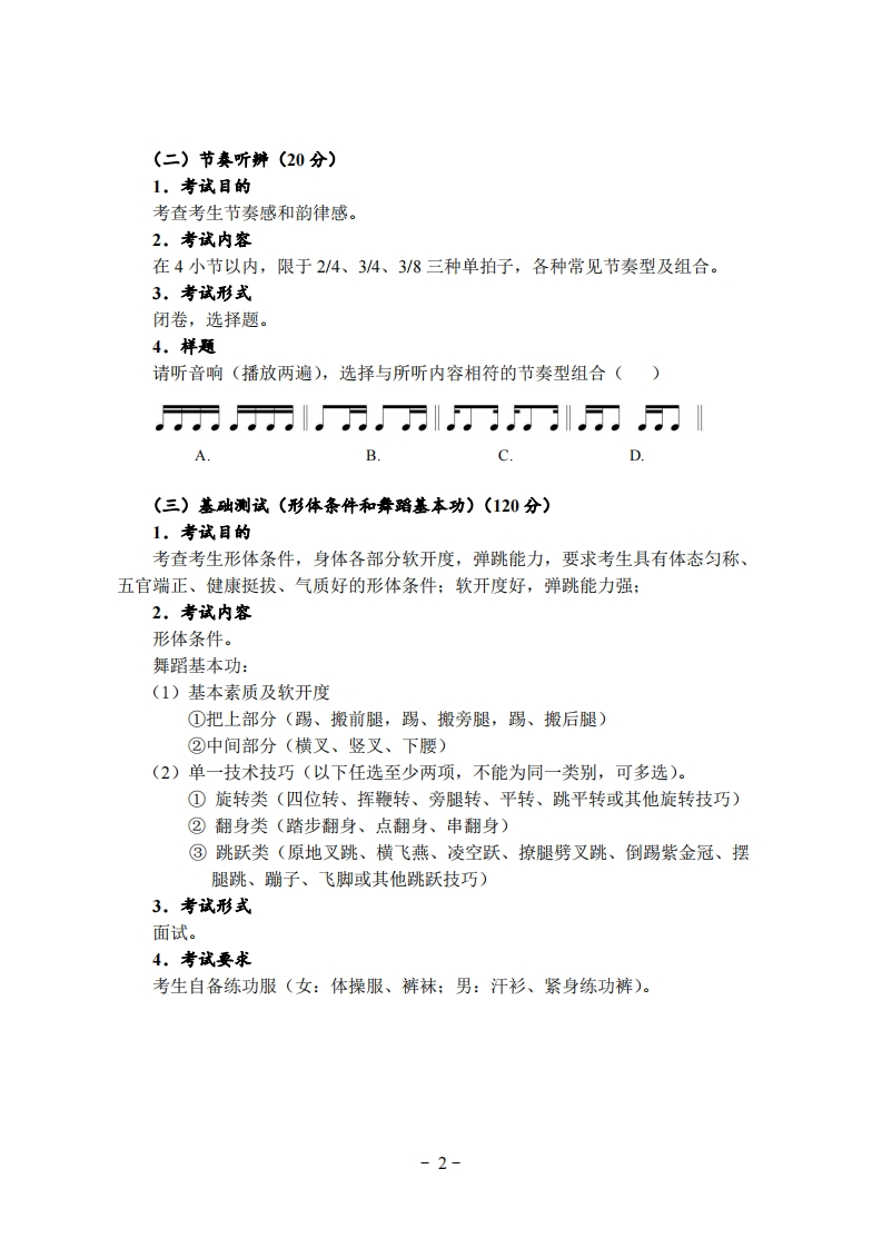 2018年湖北省普通高校艺术专业招生统一考试舞蹈学类考试大纲一、考试性质和目的普通高校艺术专业招生考试舞蹈学类全省统一考试(以下简称舞蹈学类统考)是全国普通高考的重要组成部分,考查考生的舞蹈基础、身体条件(软、开度)、节奏感、协调性和对舞蹈风格的把握能力、表现能力和表演能力,选拔出具有从事舞蹈学类专业学习的基本身体条件和具有舞蹈学类专业学习潜能的艺术类合格新生。二、考试科目和分值考试科目考试形式分值作品辨析笔试40分节奏听辨笔试20分基础测试(形体)面试,考察考生形体条件和舞蹈基本功120分基础测试(基本功)舞蹈表演面试,考生自选曲目进行表演120分总分300分注:面试科目均按百分制评分,科目成绩=科目百分制成绩×科目分值100三、考试内容和形式(一)作品辨析(40分)1.考试目的考查考生对国内外常见舞蹈作品的名称、作者、年代、民族、国别、题材、形式、风格等基本知识的掌握情况。2.考试内容考查的舞蹈作品范围详见附件《2018年湖北省普通高校艺术专业招生统一考试舞蹈学类“作品辨析”考试曲目》。3.考试形式闭卷,选择题。4.样题《醉鼓》的舞蹈表演形式是()A.独舞B.双人舞C.三人舞D.群舞-1-
