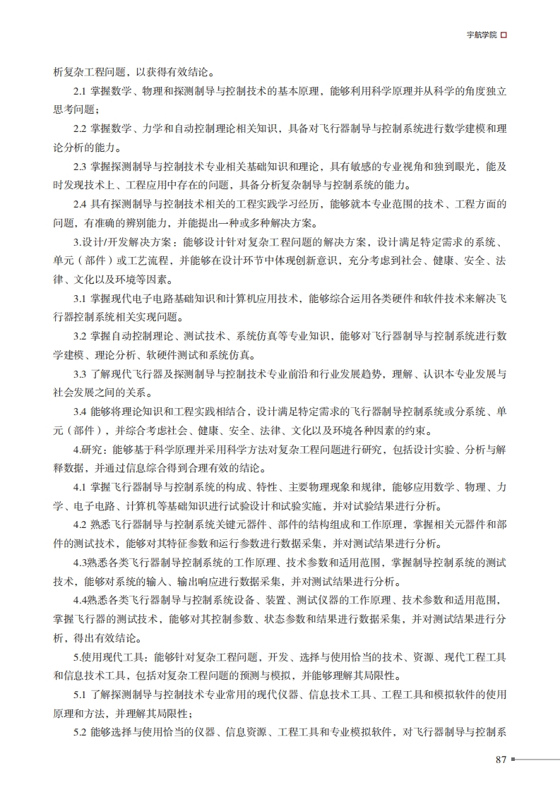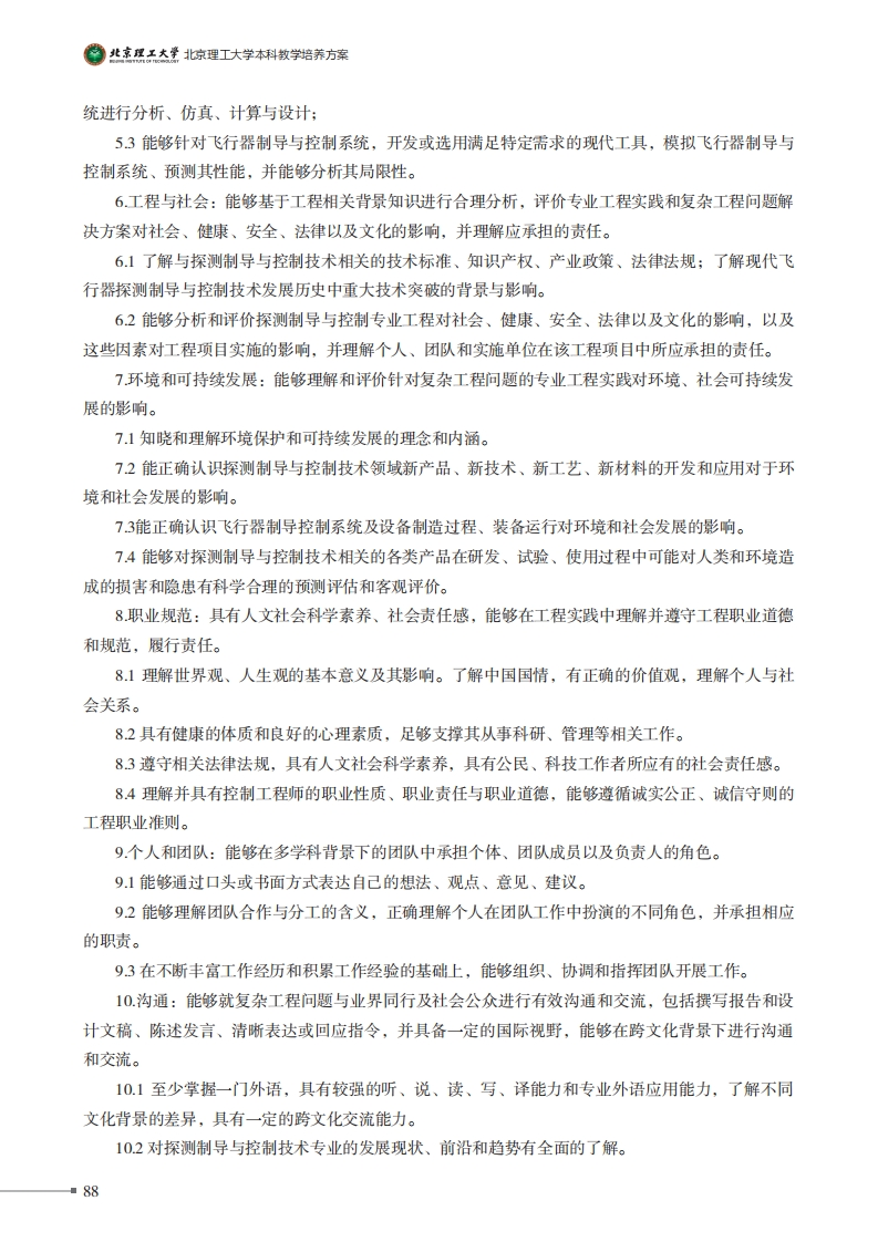 得北京理工大学北惊理工大学本科教学培养方案探测制导与控制技术专业培养方案一、专业培养日标:以“胸怀壮志、明德精工、创新包容、时代担当”的校训为指引,培养适应社会主义现代化建设需要,德、智、体、美等全面发展,基础扎实、理工结合、素质全面、工程实践能力和创造能力强的研究发展型人才。通过本专业的学习,使学生具备坚实的数学与物理基础知识,能够系统地掌握电子技术、控制理论、飞行器探测、制导与控制、导航定位等宽广的专业知识,同时培养学生进行系统分析、设计与开发的科学研究能力,具有国际化视野,思想素质、人文素养和工程素质过硬,为学生毕业后从事飞行器探测、制导与控制系统的理论研究、系统分析、设计与开发、仿真检测以及技术管理等工作和进一步深造打下坚实的基础。本专业面向未来航空宇航科学与技术学科发展,适应国家发展战略需要,培养多元化、创新型的领军领导人才,使本专业毕业生具有深厚的数理基础和宽广的专业基础知识;具备创新精神、国际视野与系统思维,能够综合运用数理工多学科专业知识,解决复杂工程问题。本专业学生毕业后5年左右,预期达到以下目标:(1)具有良好的道德素质和人文科学素养:(2)能够综合运用所学专业知识解决探测制导与控制技术领域的具体问题,成为专业技术骨干;(3)具有良好的团队组织协调、沟通表达及竞争与合作能力;(4)能够胜任专业团队合作中的角色,具备技术带头人的潜力和未来管理者的领导能力:(5)具有终身学习意识和能力,不断进行知识的更新,以适应社会和科技发展的需要;(6)具有国际视野和国际交流合作能力,能在本专业范围内与国际同行进行学术交流。二、毕业要求1.工程知识:能够将数学、自然科学、工程基础和专业知识综合运用于解决复杂工程问题。1.1掌握自然科学和工程基础知识,能够深入理解和认识探测制导与控制领域复杂工程问题。12能够运用数学、物理和专业知识对探测制导与控制领域复杂工程问题进行抽象建模和分析。1.3能够将专业知识和数学建模方法用于探测制导与控制技术专业工程问题解决方案的比较与综合。2问题分析:能够应用数学、自然科学和工程科学的基本原理,识别、表达、并通过文献研究分■86