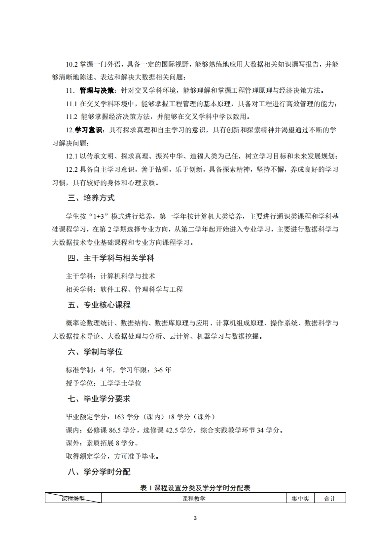 数据科学与大数据技术专业培养方案专业代码:080910T专业名称:数据科学与大数据技术一、培养目标1.基本培养目标培养的学生身心健康、知识结构合理,有健全的人格、高尚的人文情怀和社会责任感,有一定的批判思维与创新能力、科学研究能力、语言文字表达能力、终身学习能力和组织管理能力,具有国际视野和团队合作精神。2.专业培养目标本专业坚持立德树人根本任务,培养德智体美劳全面发展的社会主义建设者和可靠接班人,具有宽厚的数据科学基础理论和系统的专门知识,掌握大数据采集、存储、处理与分析及可视化表达和行业应用的技术与方法,受到大数据思维素养、大数据建模、大数据挖掘、大数据编程、大数据平台与工具等方面系统性的实践训练的创新复合型人才。毕业生可在计算机科学与技术、软件工程、管理科学与工程、农业工程等学科深造提升,也可在企业、政府、金融、高校等行业从事大数据管理与维护、大数据处理与分析、大数据应用等工作。二、毕业要求1.基础知识:具有一定的人文和社会科学素养,掌握人文社会科学学科基本原理和研究方法。1.1具有正确的历史观、世界观、人生观、价值观和高尚的道德品质:12掌握社会科学的基本知识,了解基本研究方法,具有人文情怀和社会责任感。2.工程知识:能够应用数理知识、自然科学和信息技术解决复杂工程问题。2.1掌握数理与逻辑分析、大学物理的基本知识:2.2掌握现代网络技术、通信技术和信息处理技术等的基本知识:2.3掌握生态环境与人类命运、科技创新与社会发展、农业发展与政策法规、传统文化与世界文明等方面的基本知识。3.分析问题:能够应用自然科学和工程科学的基本原理,识别和判断大数据核心科学问题,分析文献获取解决方案并验证其合理性。3.1能够应用数理知识对大数据复杂工程问题进行正确建模和表达,并能通过分析文献寻求解决方案:32能够对大数据复杂工程问题进行设计,提出解决方案:33针对大数据复杂工程问题的关键影响因素,验证解决方案合理性。