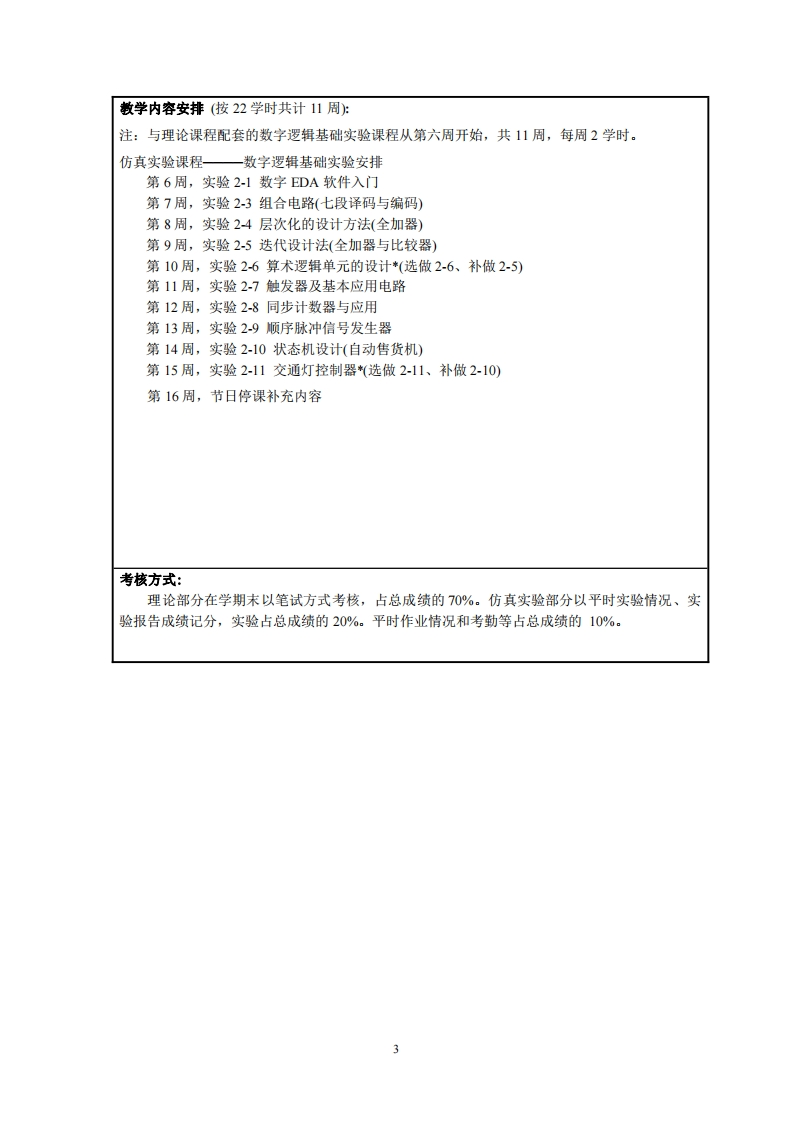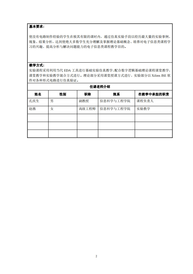 复旦大学课程教学大纲课程名称课程代码NF0120010.05编写时间2016年3月17日星期四课程名称数字逻辑基础实验英文名称Essential Experiment of Digital Logic学分数0.0周学时2开课院系信息科学与工程学院任课老师孔庆生、赵燕预修课程无课程性质专业必修课程《数字逻辑基础实验》是复旦大学自2003年2月起为实施理科技术类平台课程计划而开设的基础实验课程,教学对象为理论课程《数字逻辑基础》的选课学生(不是理论课程《模拟电子线路》的选课学生)。基础实验教学采用与理论课程教学目的进程并行的双学期制,时间安排为从每学期第6周开始至期末,每周2学时,每学期22学时。结合理论课程而开设的电路基础实验课程,能够以有限的课时,使学生通过波形观察、电路参数与现象的对应关系比较,促进对理论知识的学习。数字逻辑基础实验内容包括数字EDA软件入门、组合电路的分析和验证、组合电路(七段译码器与编码器)的设计、层次化的设计方法(全加器设计)人迭代设计法(4基本内容简位全加器与数据比较器的设计)、算术逻辑单元的设计、触发器及基本应用电路、介同步计数器与应用、顺序脉冲信号发生器、状态机设计(自动售货机)、交通灯控制器等十一个实验。散材和教学参考资料作者书名出版社出版日期孔庆生模拟与数字电路基础实验复旦大学2014/9陈光梦数字逻辑基础(第三版)复旦大学2009/12教材和Stephen Brown,教学参考资Zvonko Vranesic著,数字逻辑基础与Verilog设计清华大学2014料罗嵘选译帕尔尼卡,S.(Palnitkar,Samir)等著Verilog HDL数字设计与综合电子工业2004阎石数字电子技术基础高等教育2002